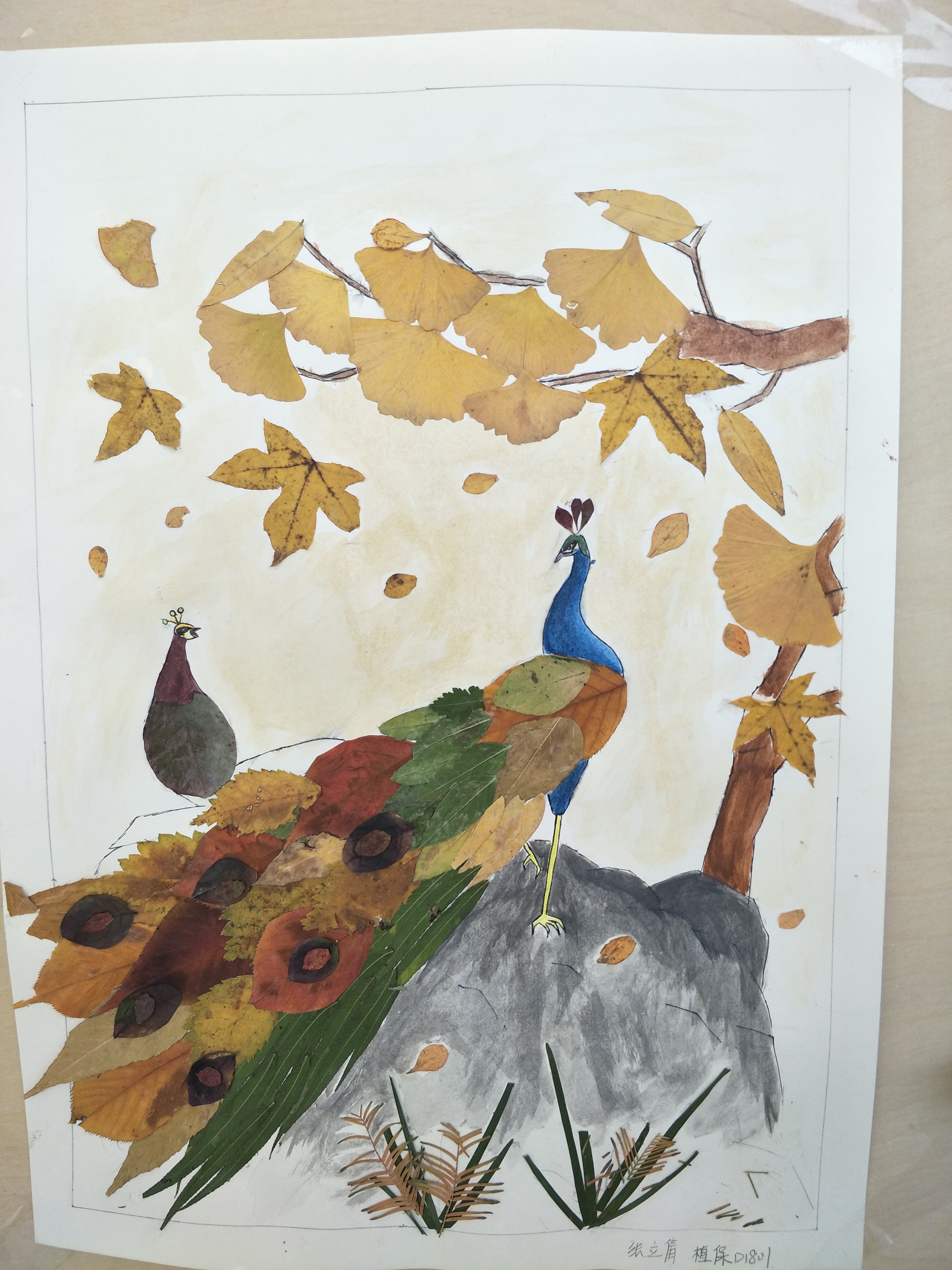 此次活动旨在号召同学们寻找身边的乐趣,留住秋天的美,动员大家发挥想象力、动手力和创造力,利用校园内的落叶进行创作。同学们利用白纸、落叶、胶水和画笔颜料等,在树叶上绘制出浩瀚星河,或是拼贴出一个俏皮可爱的小女孩。活动作品各具特色,一只只灵动的小动物形象,和一张张别有寓意的树叶画,无不展现出大家来自青春的创意和想法,让参观者眼前一亮。以植物保护D1801班张立倩同学的作品为例,简单的颜料画出树枝及两只孔雀的身体,再以各种形状和颜色的叶片拼贴出孔雀羽毛,作品整体生动而灵巧。