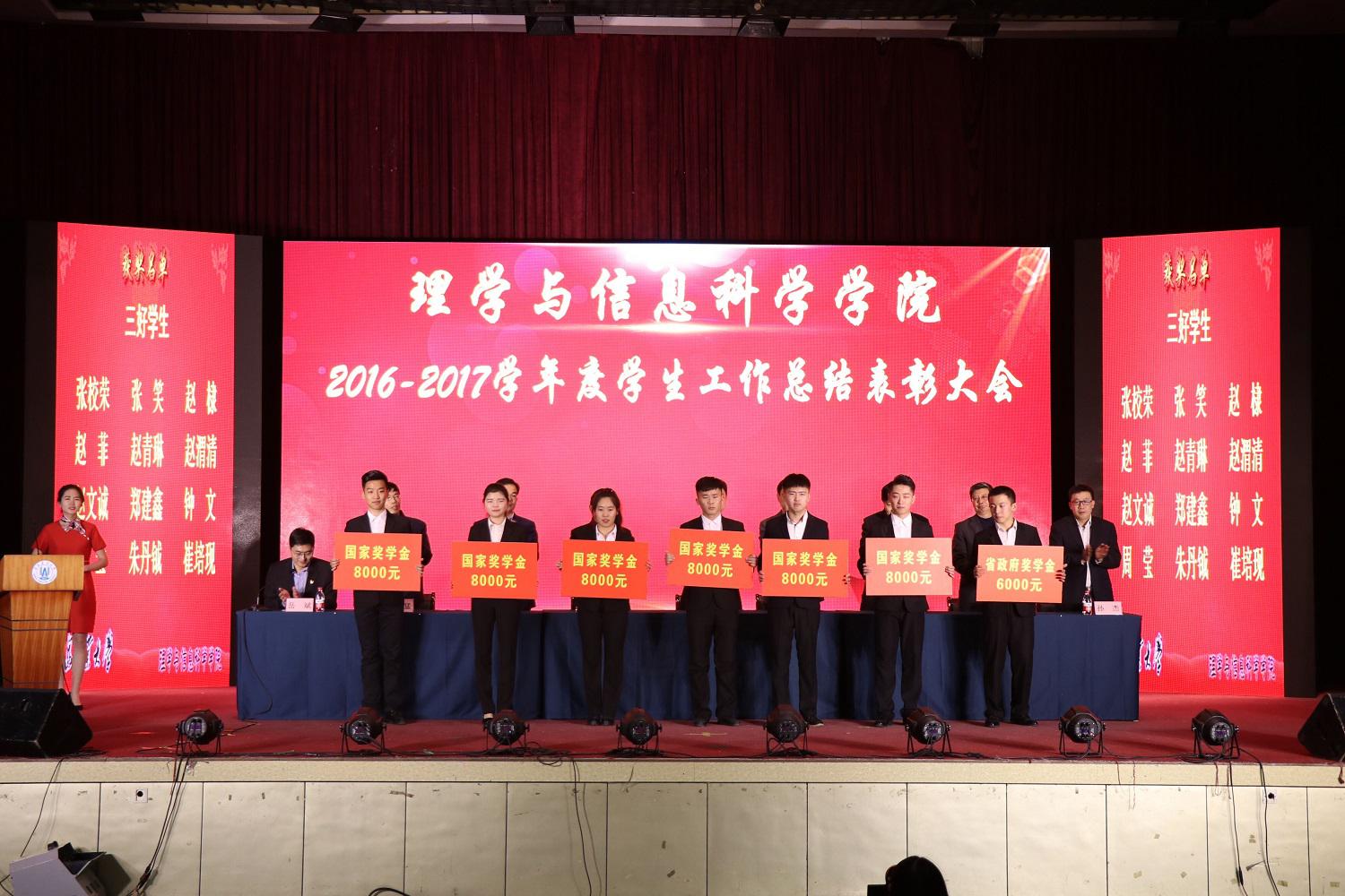 学院副院长陈龙猛宣读了《关于表彰先进集体先进个人的决定》。与会领导老师为荣获2016-2017年度国家奖学金、优秀学生奖学金、先进班级、校级三好学生、优秀学生干部等荣誉的先进集体和先进个人进行颁奖。国家奖学金获得者罗永川和新生代表冯珊珊分别发言。
