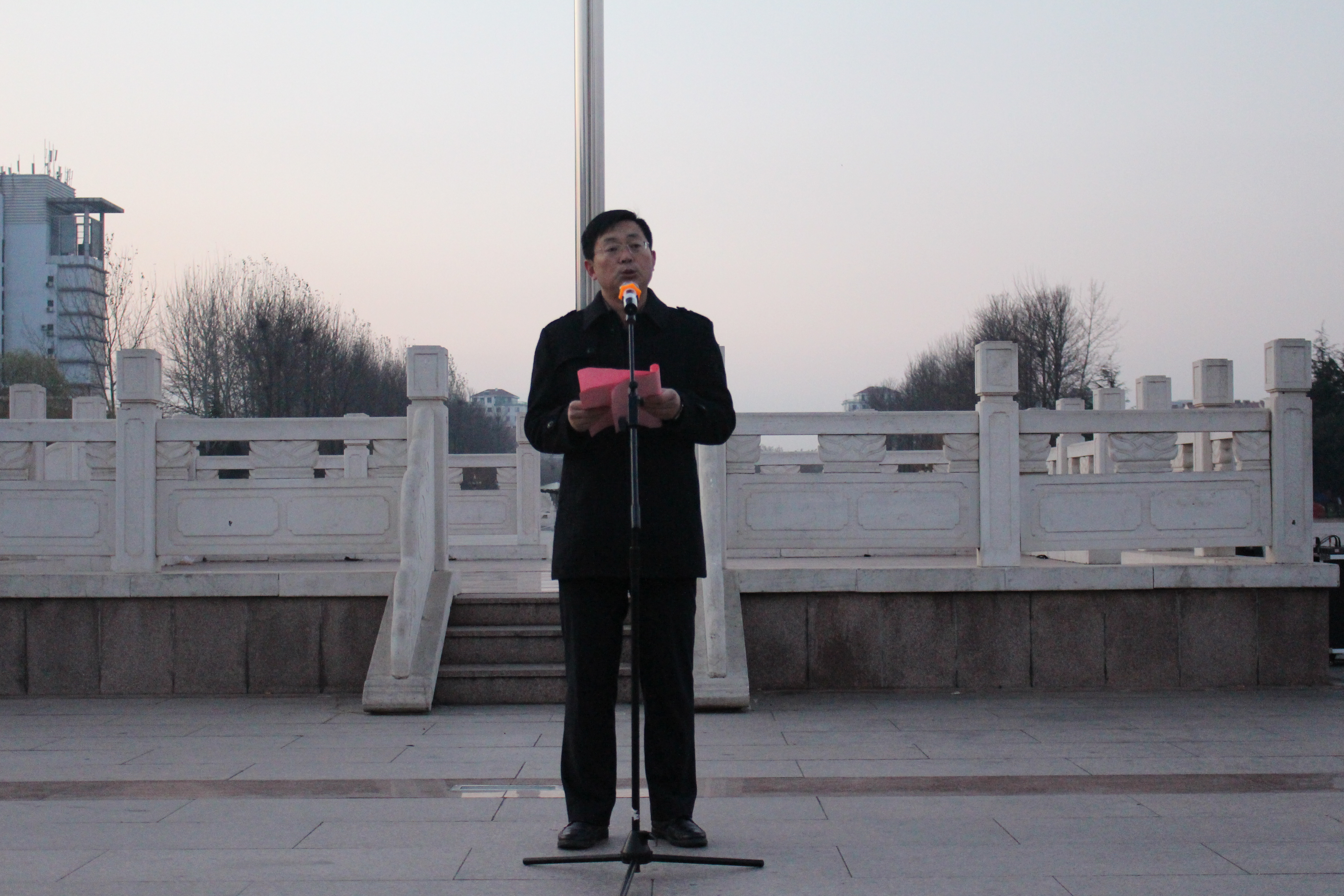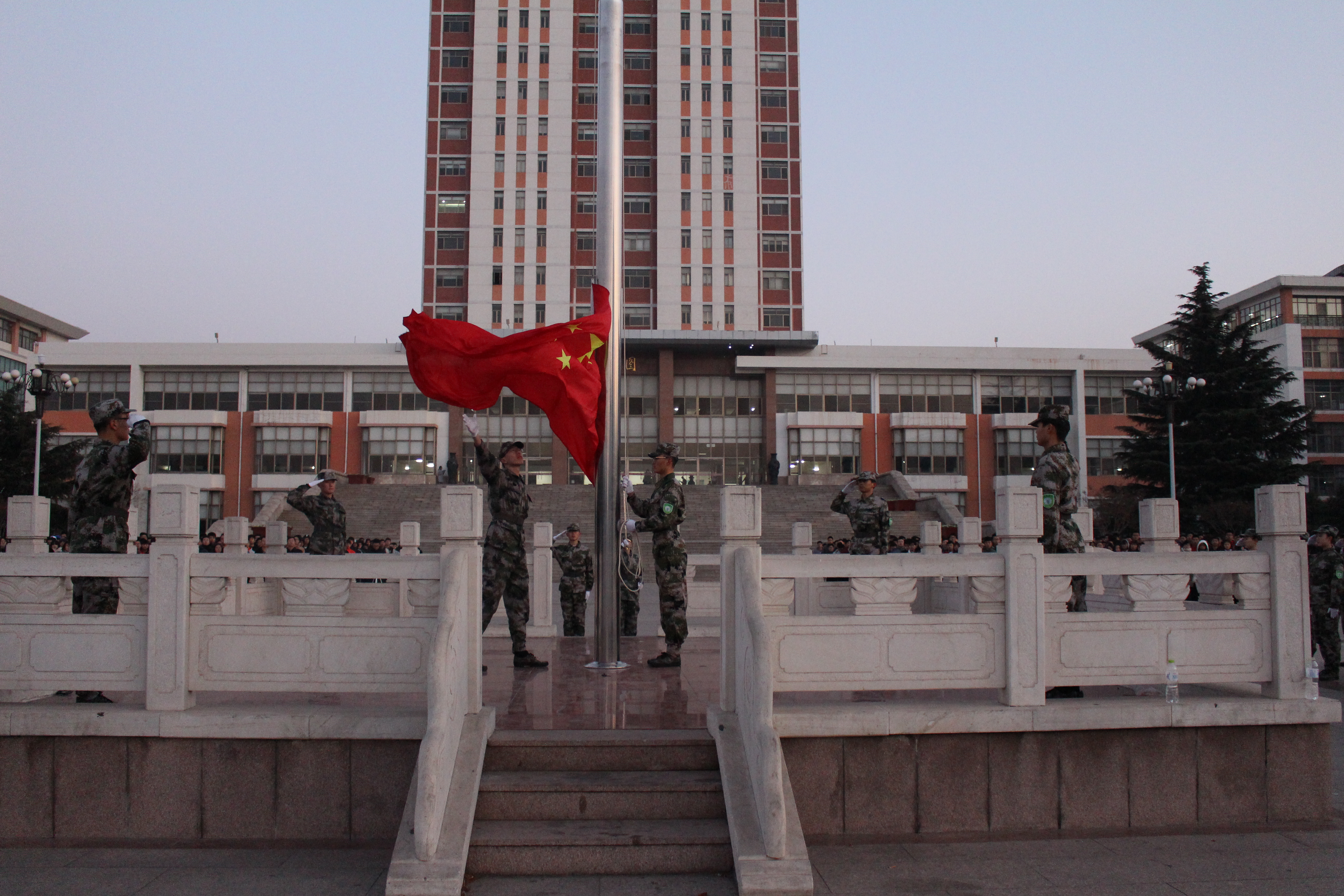 伴着雄壮的《义勇军进行曲》,五星红旗冉冉升起,全体师生行注目礼。