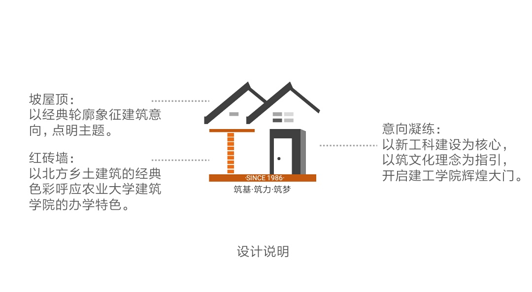 其中,郑涛设计的“筑文化”主题logo作品以新工科建设为核心,以筑文化理念为指引;以经典轮廓象征建筑意向、点明主题,以北方乡土建筑的经典色彩呼应农业大学的办学特色;并以“筑基·筑力·筑梦”为主线开启建工学院辉煌大门。刘峥设计的院徽以建筑为本、纽带为核、知识为根,体现了建筑工程学院建筑教育的特色,同时也寓意着建工人愿做筑造梦想的基石,愿将值知识转化为辅以学生前行的力量,愿为美梦成真坚持不懈的决心。