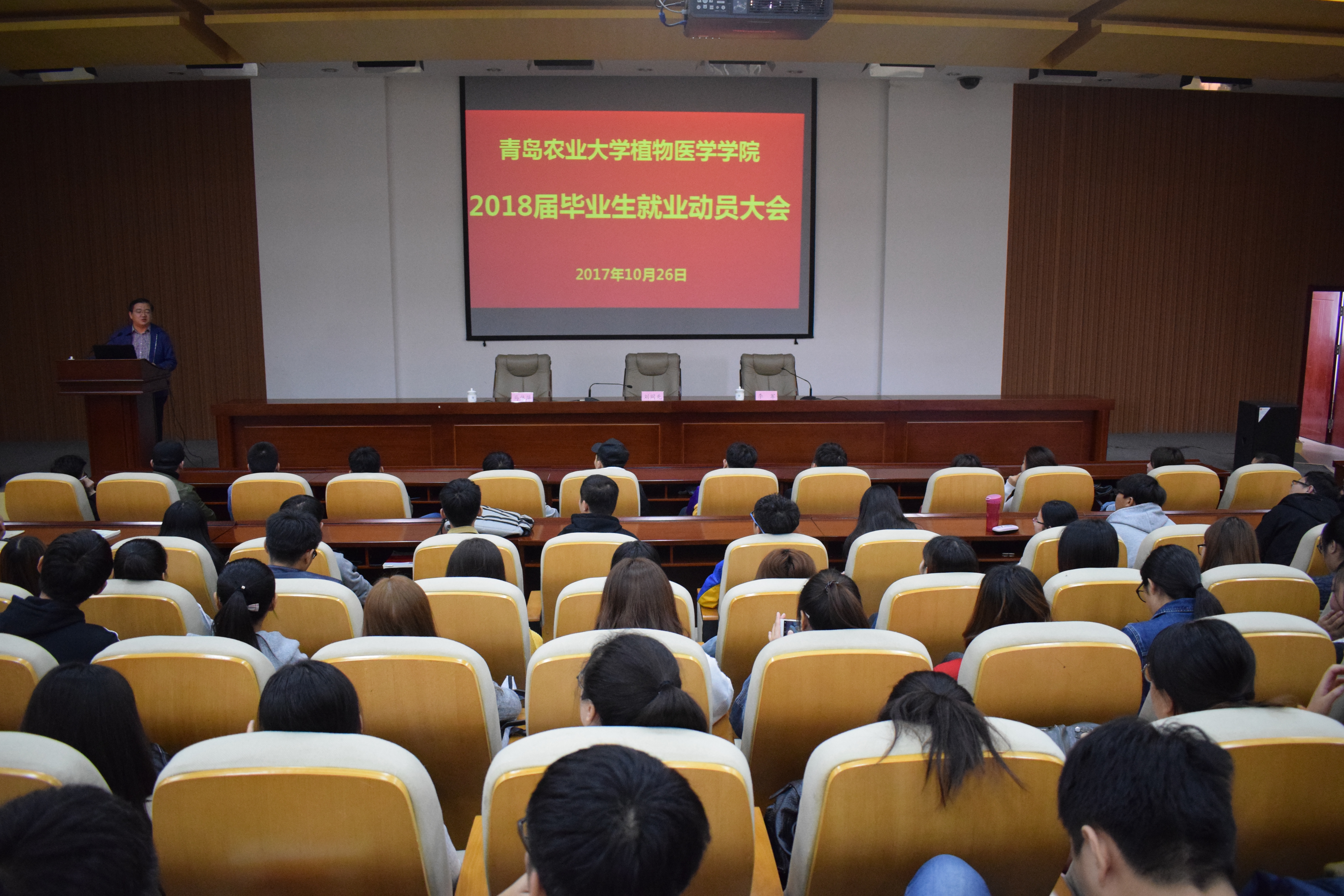 10月26日,植物医学学院在学术会馆第二报告厅召开2018届毕业生考研就业动员大会。植物医学学院院长刘同先、党委副书记、副院长李军、团委书记马伟萍、辅导员王丽静及全体2014级学生参加,会议由李军主持。