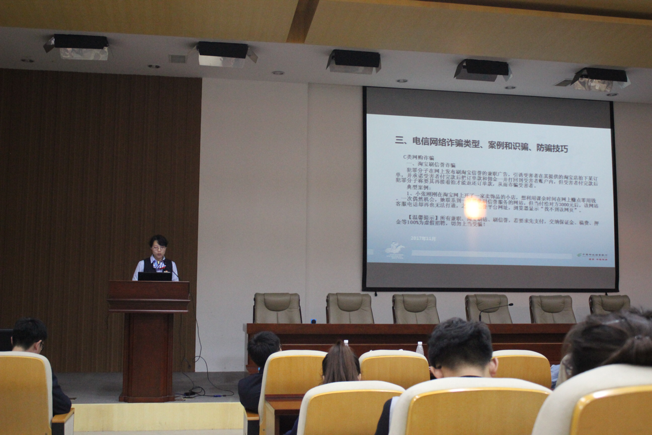 袁瑞通过ppt向同学们介绍讲解了什么是征信、征信的对象以及什么是个人信用报告等知识。为了让同学们有真切实感,袁瑞列举并分析了部门真实案例,为同学们答疑解惑。另外,柜员王静则为大家讲述了金融知识的有关问题,从防范电信网络诈骗、增强个人信息防护意识、出国留学三个方面作详细的阐述。并通过举例说明了电信诈骗的危险性,提供了相应的防骗技巧。