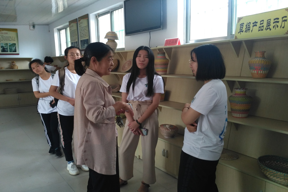 在草碾产品展示区,负责人正向队员们介绍草编的原料选取与制作过程。