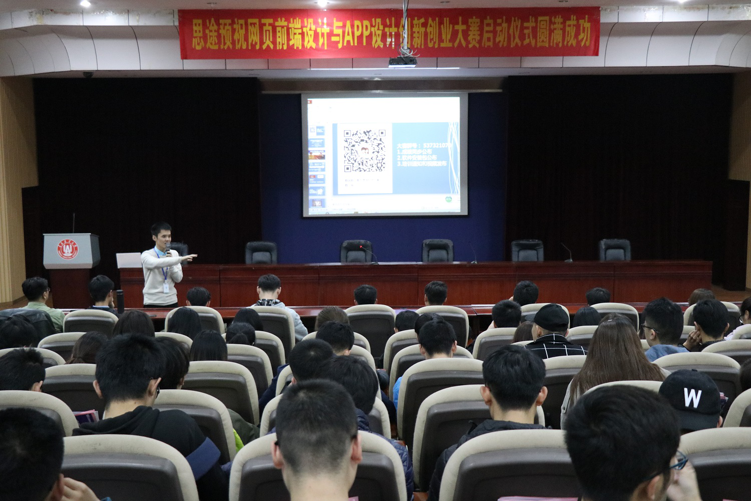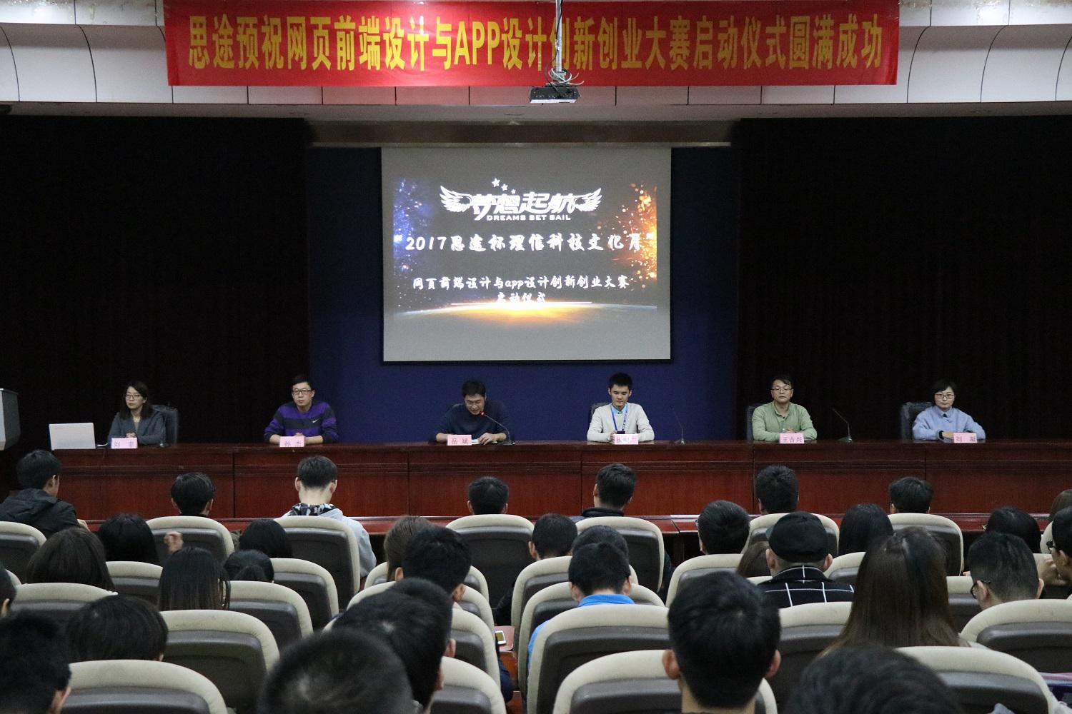 11月12日,理信学院“2017思途杯科技文化月” 暨网页前端设计与APP设计创新创业大赛启动仪式在信息楼6楼报告厅举行,学院党委副书记、副院长岳斌,团委书记孙杰,辅导员刘菲、刘凝,及思途教育科技有限公司CEO徐明广,技术总监王吉兴出席本次启动仪式,理信学院2015级全体学生参加。