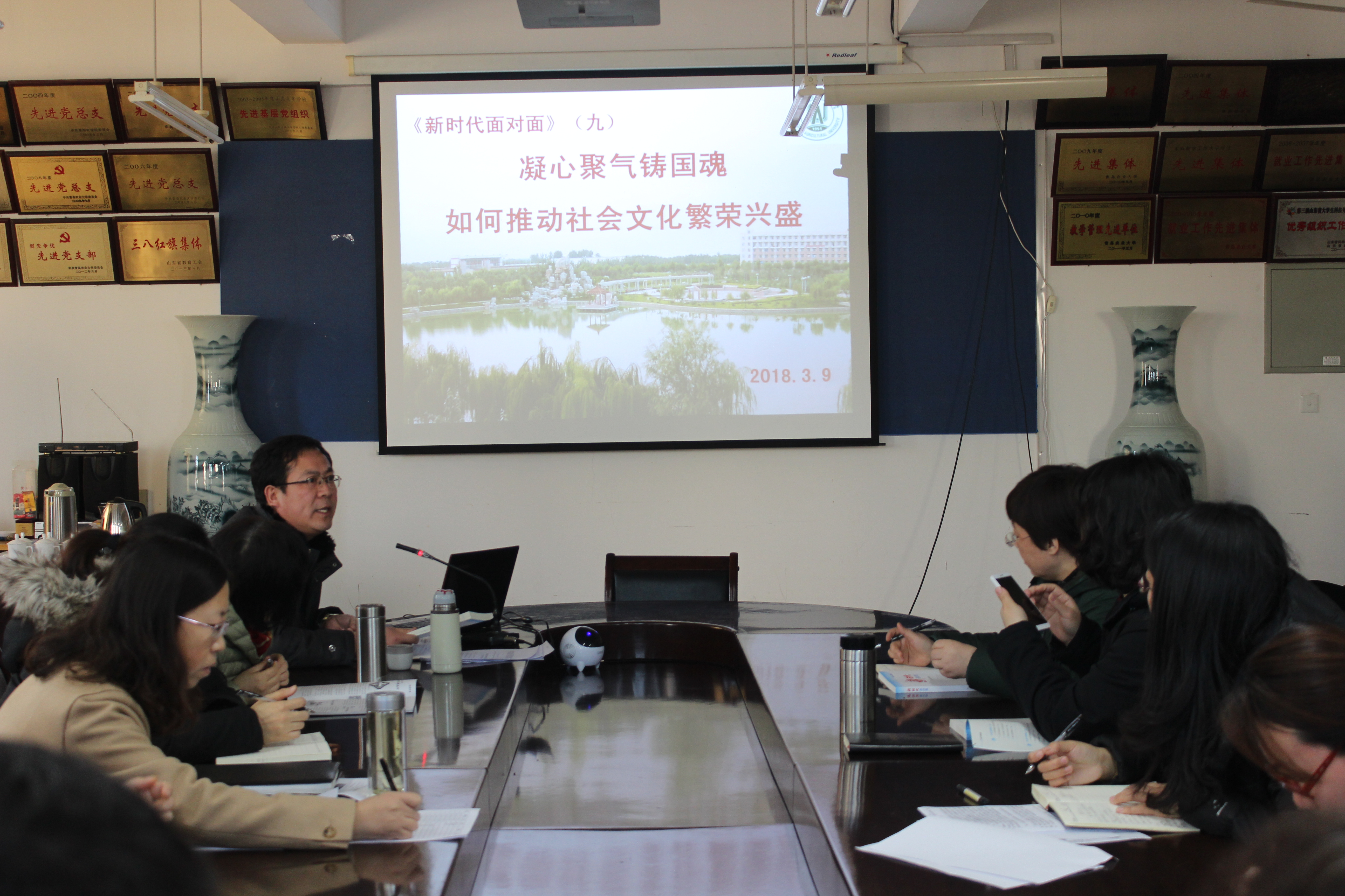 党委副书记王晓雷首先传达了校党委《关于认真组织好<新时代面对面>学习宣传工作的通知》要求,就深入做好该书的学习工作作出具体安排部署,并要求全体党员要把思想统一到学习党的十九大精神上来,深刻学习领会其思想精髓和核心要义,将学习落实到实践中去,推动学院各项事业更好发展。随后,王晓雷通过PPT的形式带领学院全体党员进行了“凝心聚气铸国魂——如何推动社会主义文化繁荣兴盛”理论学习,他从坚定文化自信、牢牢紧握领导权、弘扬核心价值观以及文化发展促繁荣四部分带领党员进行了认真的学习,并举例龚全珍、黄旭华、廖俊波等先进典型的精神品格倡导大家共同学习。