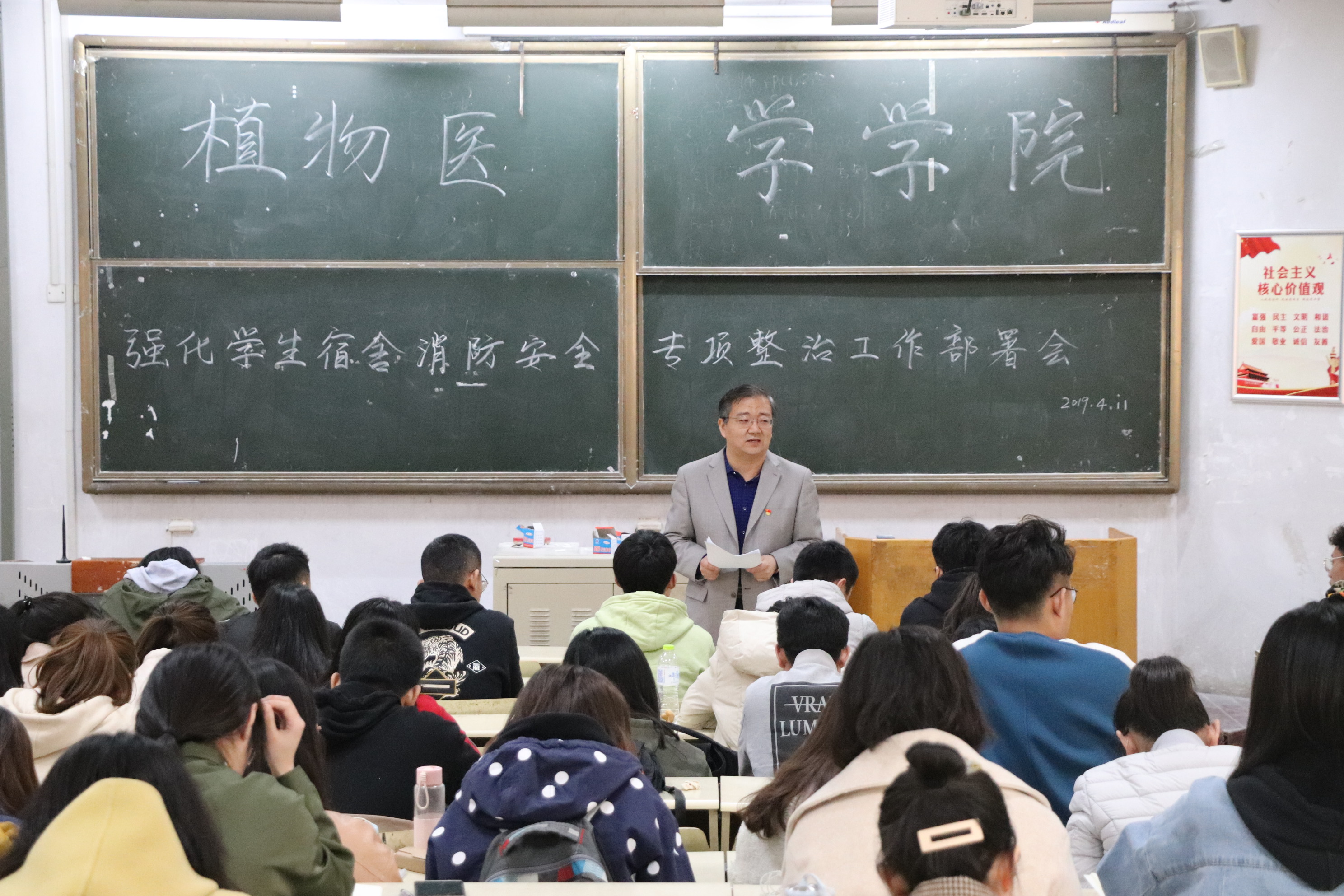 为保障学生生活环境的健康,提高消防安全意识,4月11日,植物医学学院在教学区B召开强化学生宿舍消防安全专项整治工作部署会议。学院党总支副书记、副院长李军,团委书记马伟萍,辅导员王丽静,全体学生干部参加会议。