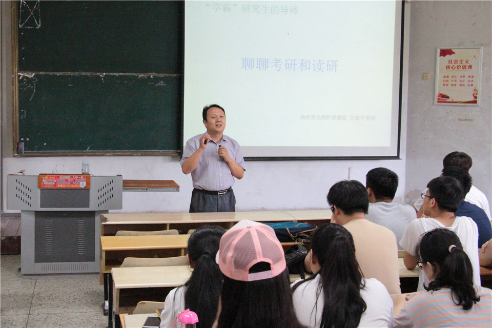 会议伊始,王进平教授首先对考研相关事宜进行详细介绍。王进平教授表示,考研要求要目标明确,方向专一,要充分了解自己要报考学校、专业、考试科目、历年分数线及报招比例人数;其次制定计划,执行计划,及时总结修正,确选择适合自己的复习参考书;熟悉了解相关导师的信息,征求自己学校老师的意见。王进平教授提醒大家,只有当对自己的目标明确后,才能拥有更加广阔的发展空间。