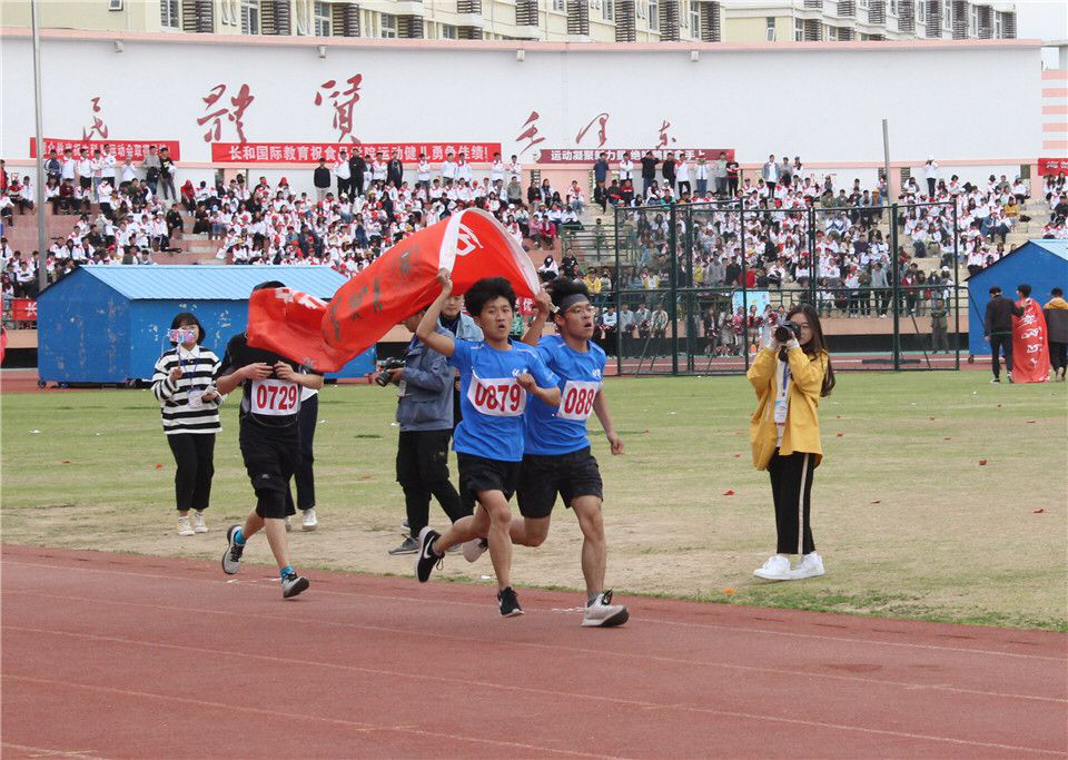 男子万米跑的赛场,学院运动员庞可心和秦田高举学院旗帜,共同跨过终点,展现出顽强拼搏的化药精神及互帮互助的体育精神。