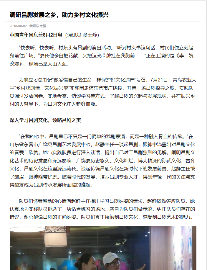 为响应习总书记“像爱惜自己的生命一样保护好文化遗产”号召,7月21日,青岛农业大学“乡村戏剧情,文化振兴梦”实践团走访东营市广饶县,开启一场吕剧探寻之旅。实践队员通过发放问卷、实地考察、访谈学习等方式,了解吕剧的兴起与发展现状,并在振兴乡村的大背景下,为吕剧文化注入新鲜血液。