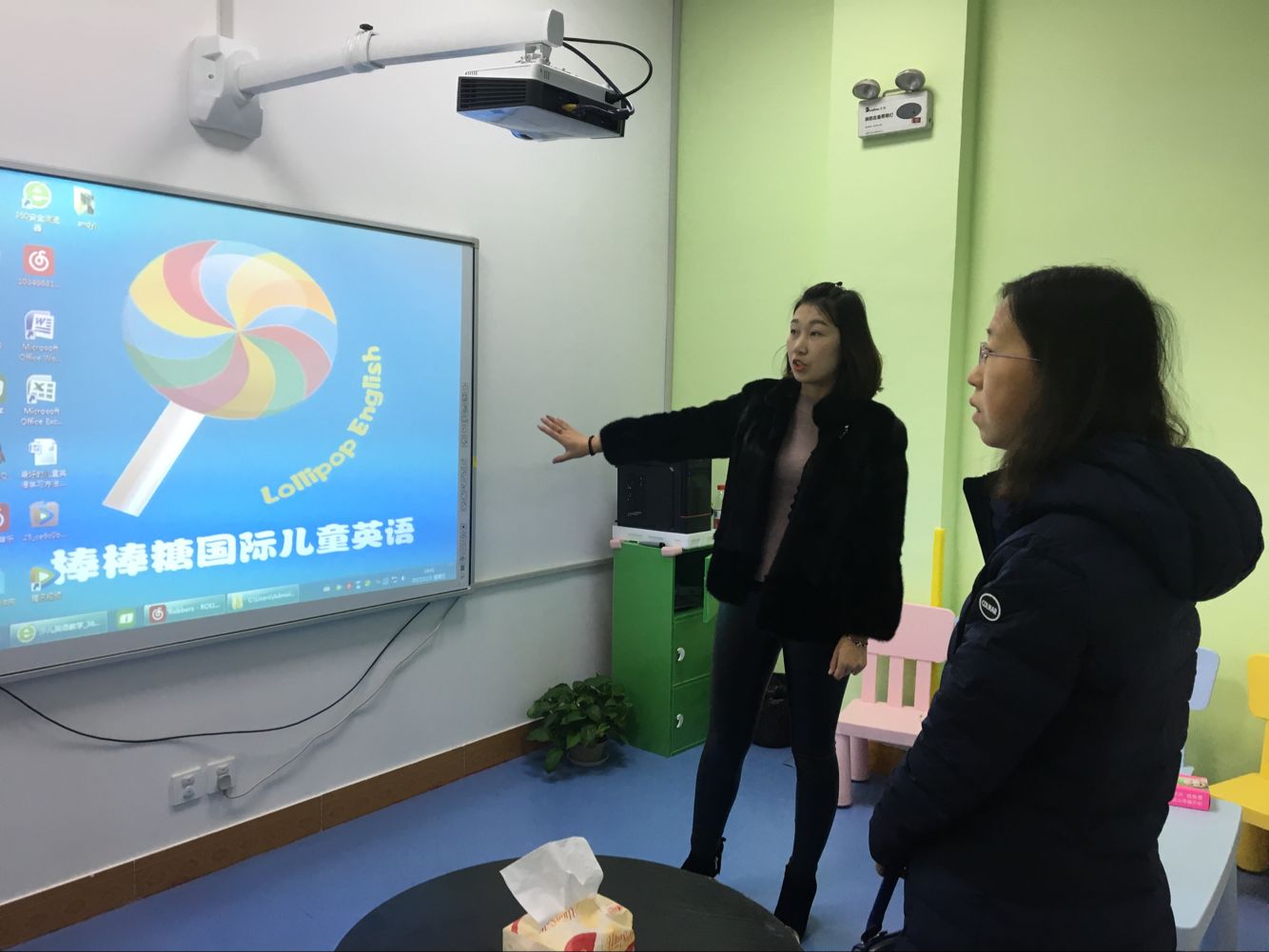 刘艳首先向有关负责人询问了棒棒糖国际英语中心的教学模式并进行参观。棒棒糖国际英语中心负责人详细介绍了机构的教学机制,教学对象主要针对于儿童,并根据不同的年龄设置了不同的楼层与教室,每个教室均配有多媒体设备与电子白板,该中心还有两名全职外教,便于为学生们提供一个更好的学习外语的机会与平台。