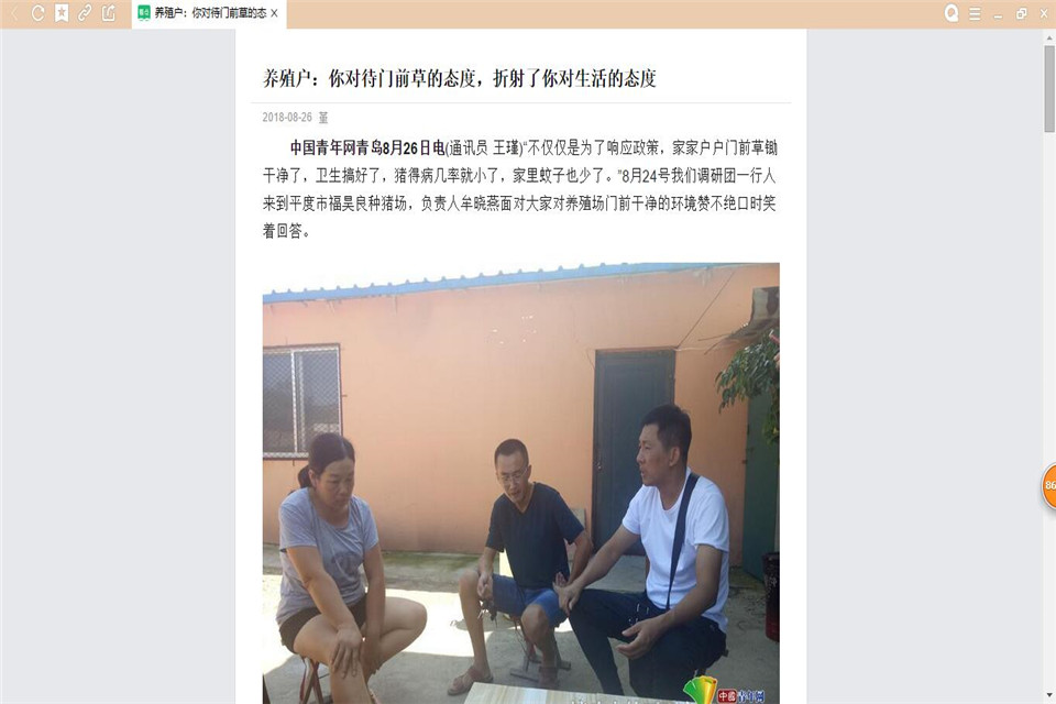 中国青年网青岛8月26日电(通讯员 王瑾)“不仅仅是为了响应政策,家家户户门前草锄干净了,卫生搞好了,猪得病几率就小了,家里蚊子也少了。”8月24号我们调研团一行人来到平度市福昊良种猪场,负责人牟晓燕面对大家对养殖场门前干净的环境赞不绝口时笑着回答。