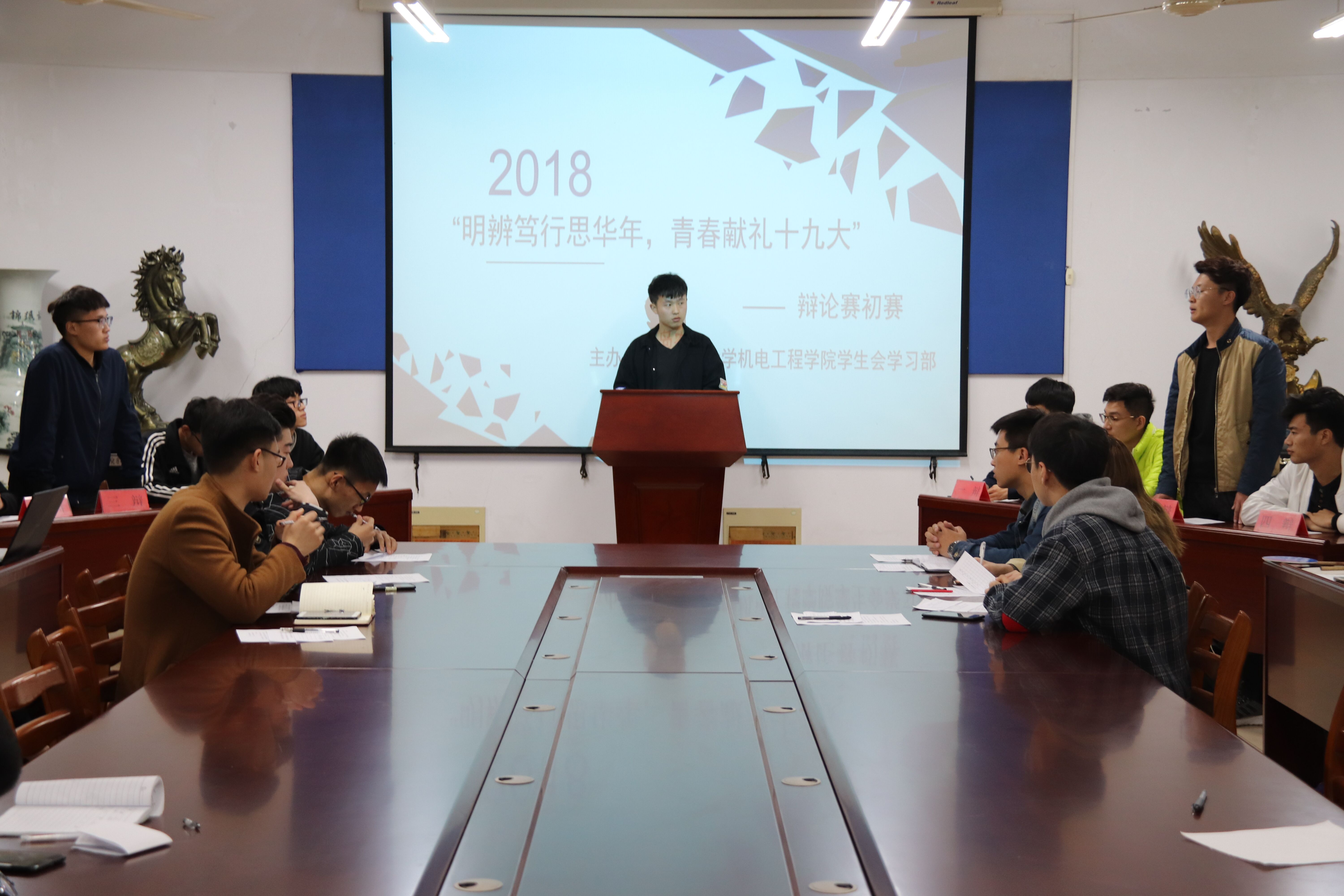 4月8日晚,机电工程学院举办“明辨笃行思华年,青春献礼十九大”辩论赛学院初赛。学院学生会主席李永超,副主席兼学习部部长刘英琦,新闻中心主任郑茜,宣传部部长魏浩,文艺部部长巩佳鑫担任评委。