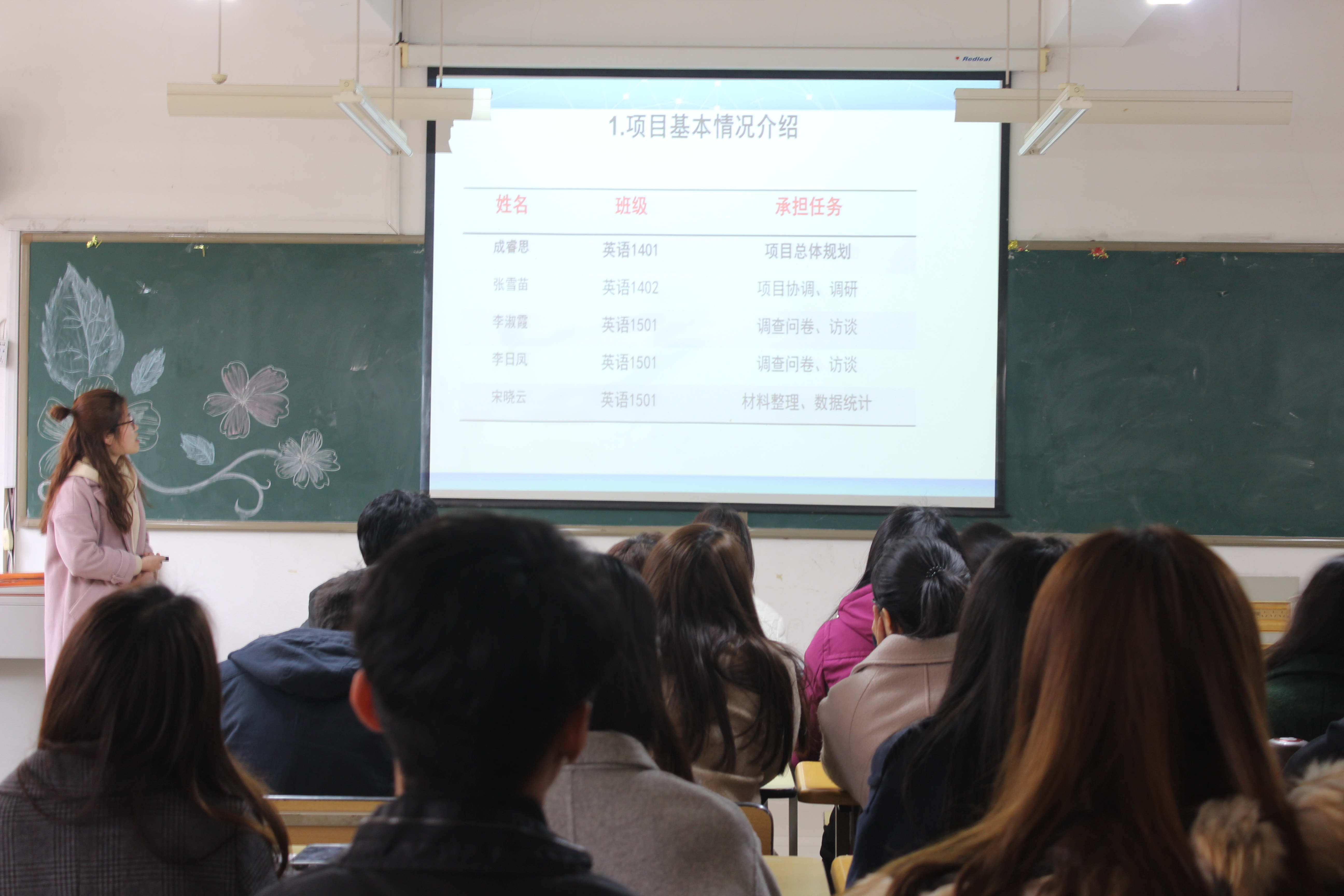 共有十六位项目负责人上对项目的实施过程、完成情况、研究成果、创新点、存在的问题、经费使用等进行了汇报(PPT形式,5-10分钟),并回答专家质询。会议初,李春梅对同学们的汇报课题提出几点要求:汇报课题语言应简洁明了;项目介绍应从研究内容、研究结果、如何进行研究等方面来汇报。各项目负责人以PPT的形式对创新项目进行了成果展示,从研究目的、研究方法、项目简介、团队分工、项目成果、研究中存在的问题及解决措施、经费使用情况等方面进行了生动简洁的汇报。