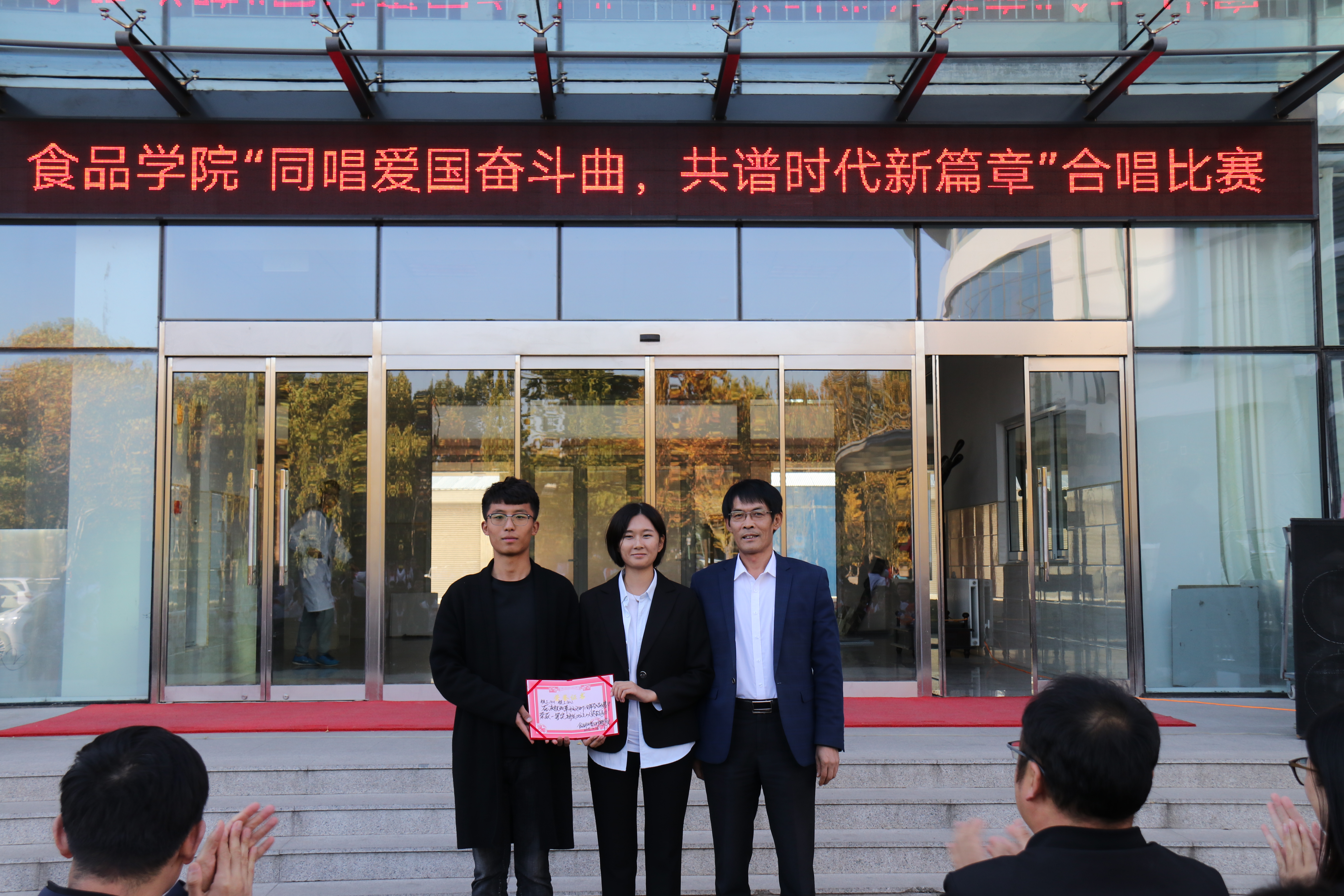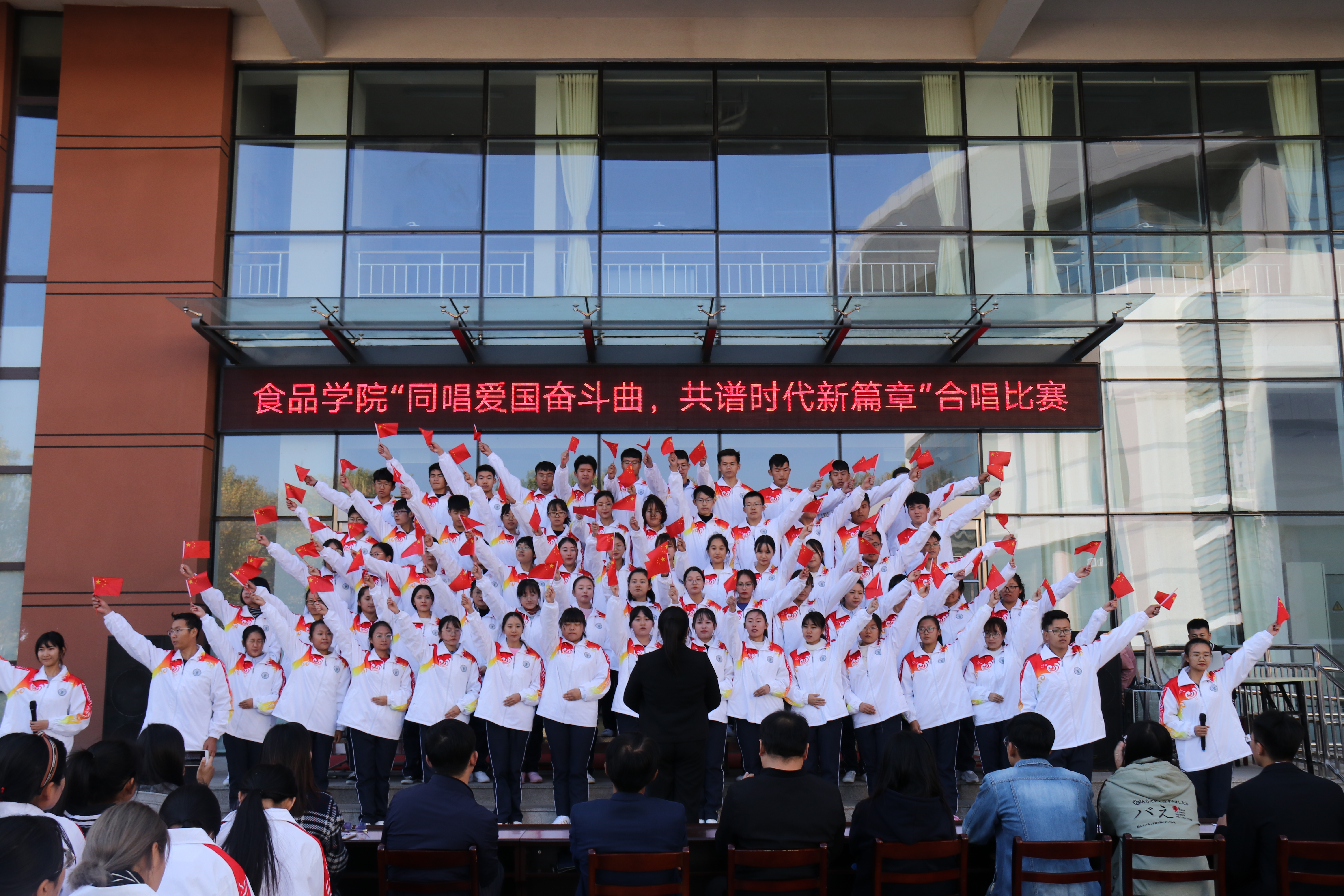 为贯彻落实《关于在全校师生中深入开展“弘扬爱国奋斗精神,建功立业新时代”活动的通知》(青农大宣字[2018]23号)精神要求,10月28日,青岛农业大学食品科学与工程学院在食品楼前举办 “同唱爱国奋斗曲,共谱时代新篇章”合唱比赛。学院党委书记何忠诚,党委副书记宋伟,团委书记李永青,辅导员赵莹、孙晓东、江巧宁、班主任代表李曼和学生会主要学生干部等出席了此次活动。