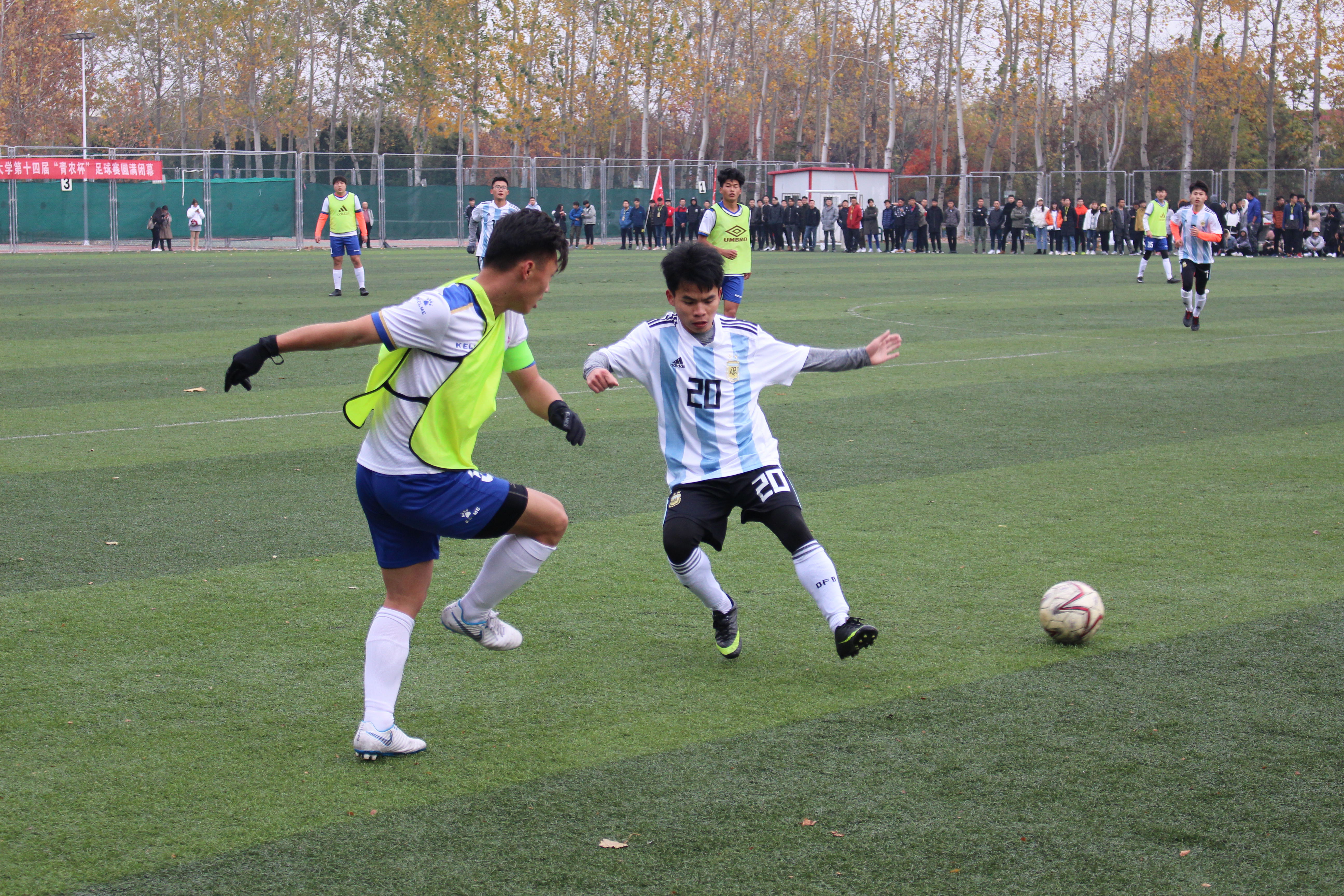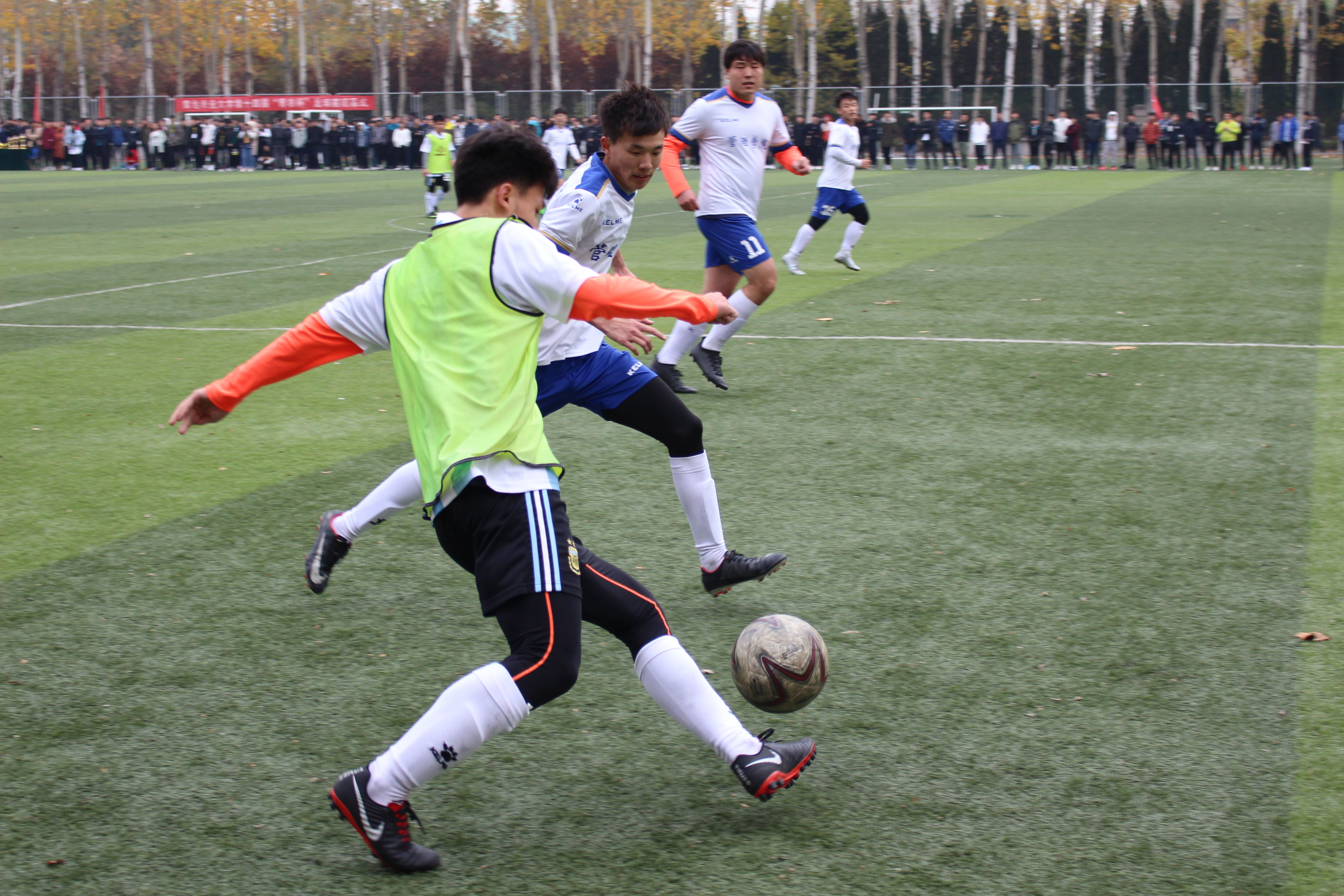 “青农杯”足球赛决赛在校东足球场举行。随着主裁判的一声哨响,双方队员迅速进入比赛状态,展开凌厉攻势。上半场对方率先进球,机电队员迅速调整战术,张腾跃在队友助攻下进入对方禁区射入一球。下半场交换场地后,双方球员拼抢激烈,比赛进入白热化,机电队员气势不减,多次逼近对方半场,张腾跃带球进入对方禁区,再入一球,机电工程学院最终以3:2锁定胜局。