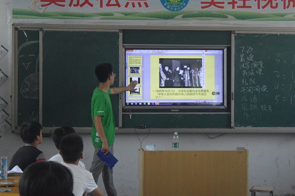 队员们带领商丘万堤口小学的同学们回顾历史,感受中国的发展历程。小增老师告诉大家,“1840年的时候啊,英国向咱们出口了好多鸦片,鸦片害人啊”。从鸦片战争、八国联军侵华、甲午海战到抗日战争、解放战争、中华人民共和国成立。老师一边讲解,同学们一边感叹,“我们不能老让别的国家欺负啊,多亏了毛主席!”从落后挨打到现在国际地位举足轻重,离不开国防力量的发展,综合实力的提升!