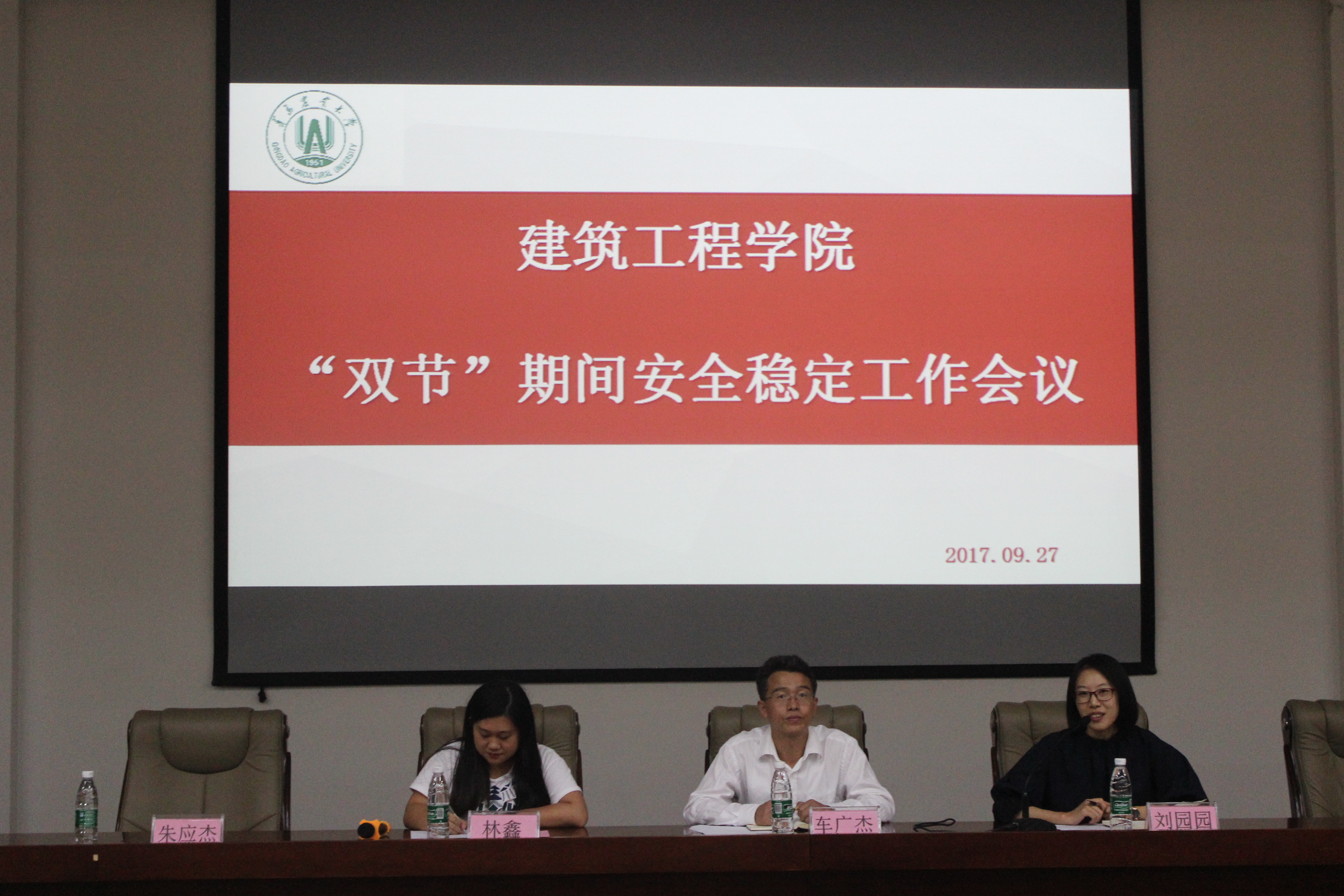 9月27日,建筑工程学院在报告厅召开中秋、国庆节“双节”假期学生安全稳定工作会议。院党委副书记、副院长、学工办主任车广杰,院团委书记刘园园,副科级辅导员林鑫出席会议,院学生会主要学生干部,各班班长、团支部书记参加。
