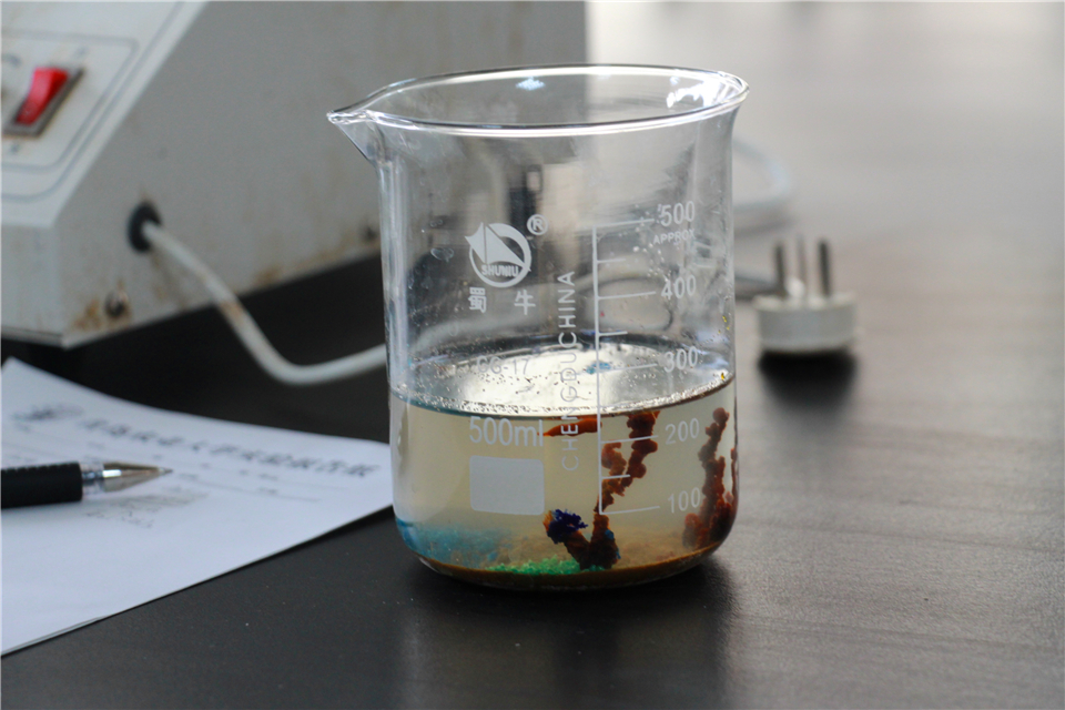 实验采用一人操作,另一人讲述实验原理的合作方式,在培养同学们实践动手能力的同时也提高团结协作能力。比赛过程中,选手们小心谨慎,默契配合,严格遵守操作规则,正确使用实验仪器,准确把控药品用量,认真观察和记录实验现象,注重实验安全,力求把每一个环节做到最好。玲珑剔透的“冰花”在玻璃棒顶端悄然绽放,鲜艳明丽的“烟火”在试管中频频闪现,碘酒在“深蓝色、琥珀色、无色、深蓝色”之间循环往复、接连不断,光怪陆离的“植株”在烧杯中吐芽抽枝,一个个美妙绝伦的实验现象无不散发着化学的魅力。