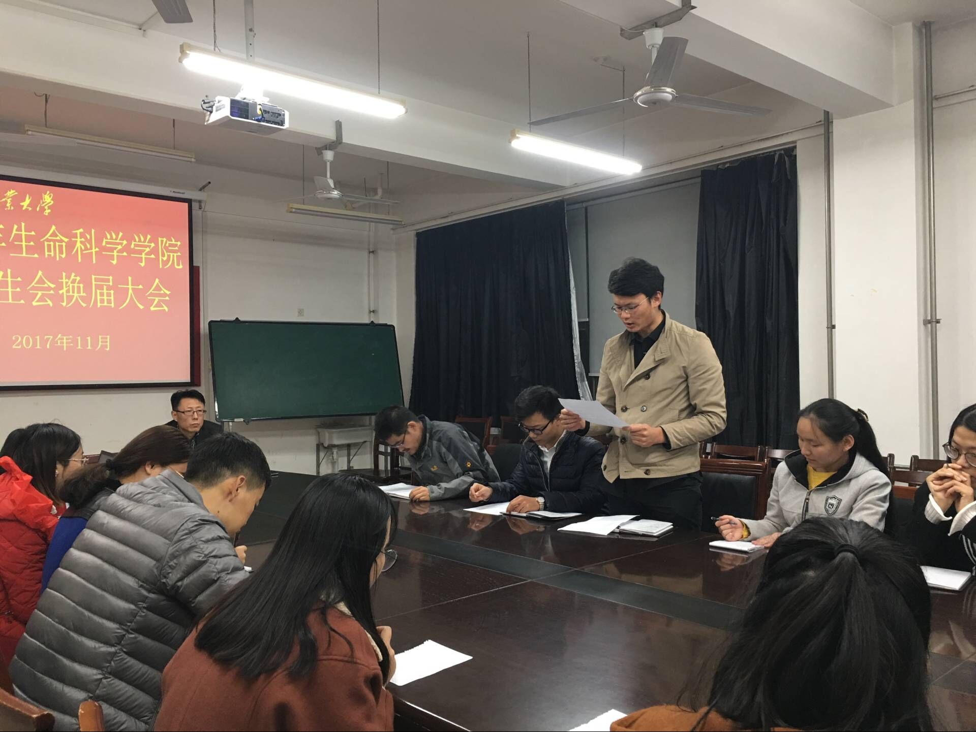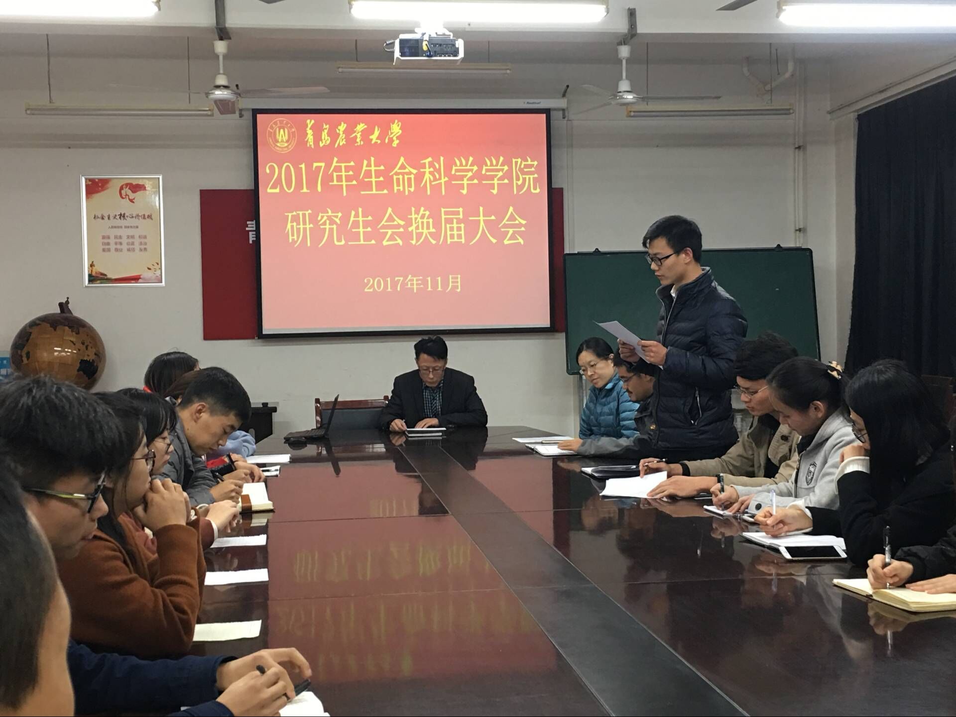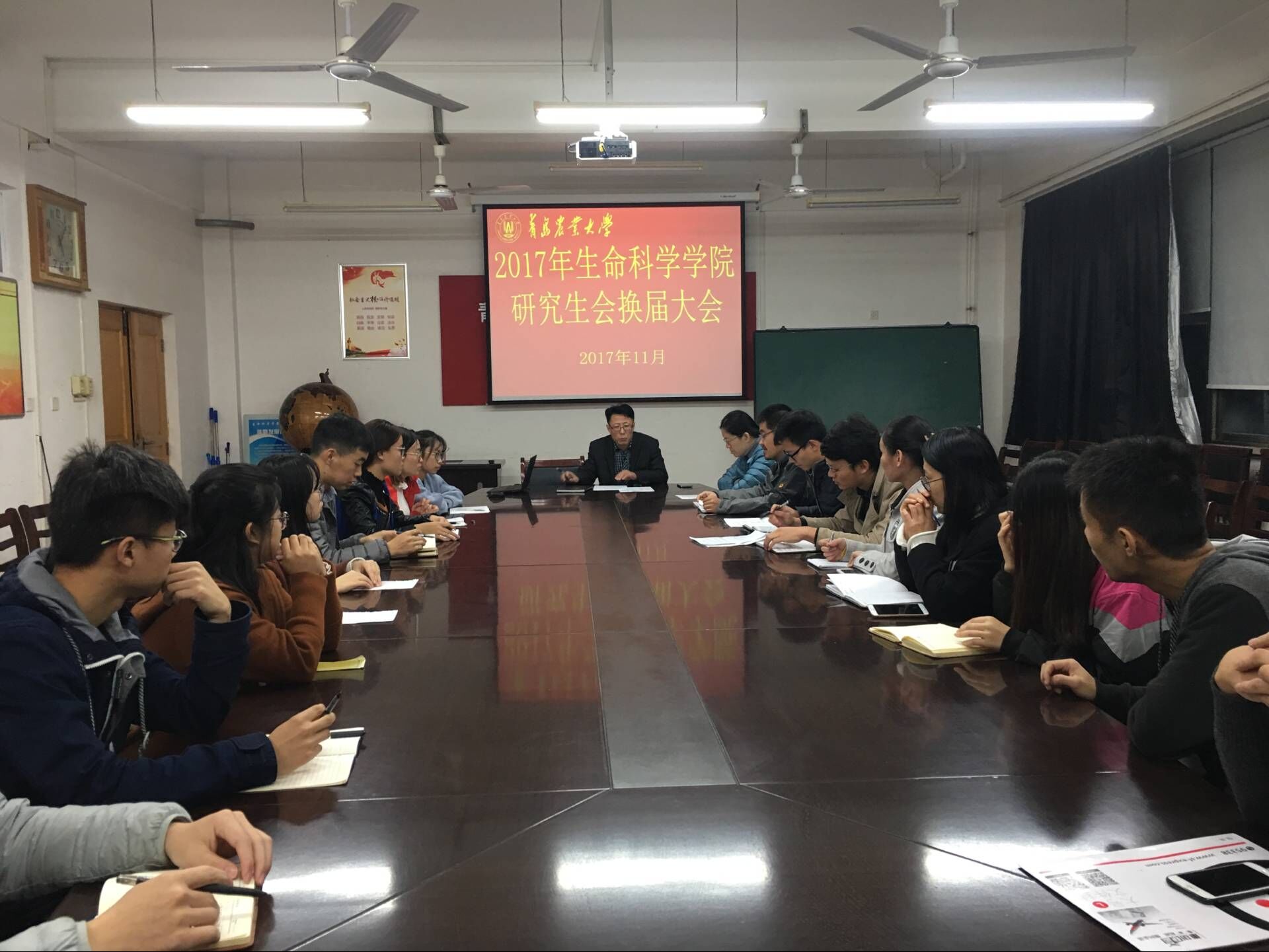 11月13日,生命科学学院在资料室举行研究生会换届大会。学院分党委副书记、副院长初文杰、正科级辅导员祁琳、研究生秘书孙阳老师出席会议。会议由研究生秘书孙阳老师主持,两届研究生会成员以及2017级部分研究生参加。