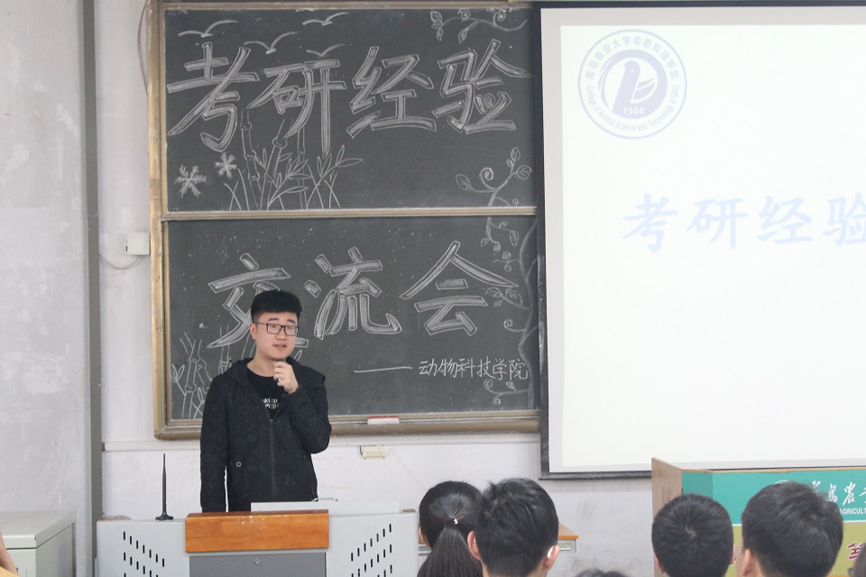 4月21日,动物科技学院举行考研经验交流会,学院考入中国农业大学的赖金花等2019届考研成功的六名同学分享了学习经验。学院党总支副书记、副院长展学斌出席会议,有考研意向的各年级同学参加会议。