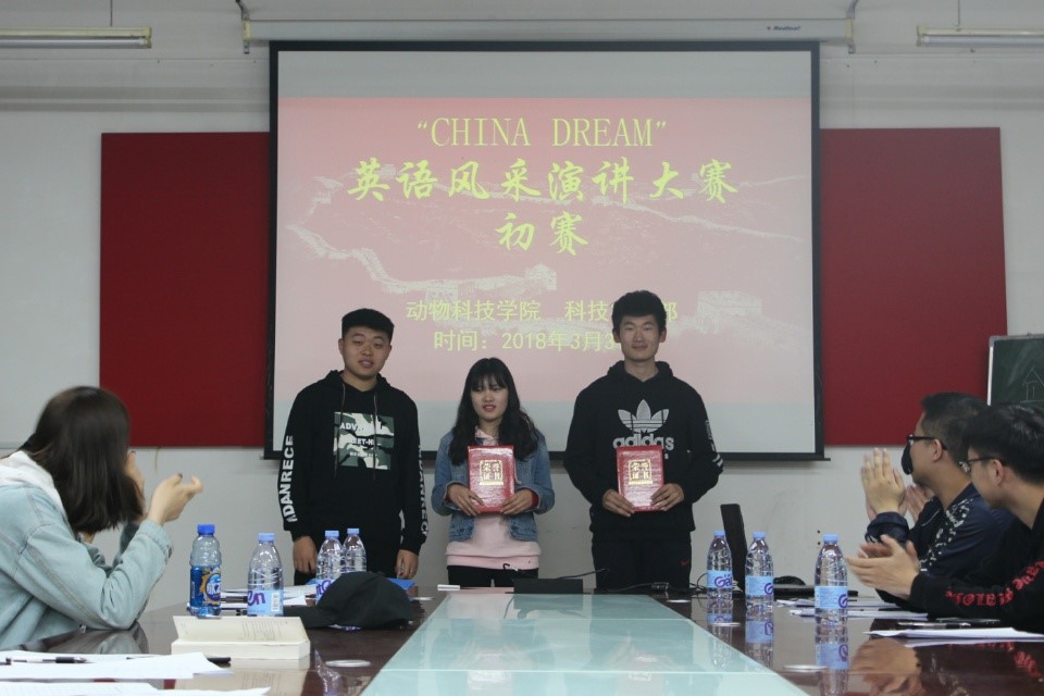 3月31日,动物科技学院于会议室举办“China Dream”英语风采演讲比赛,动科学院学生会干部陈杨、李尚汝、李晓晖等担任比赛评委,共有9位同学参赛。