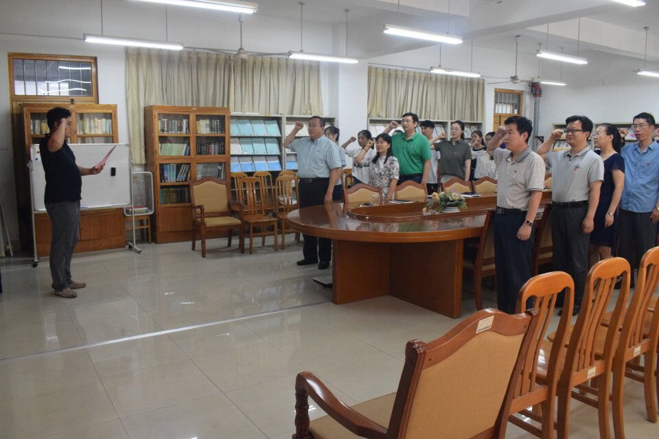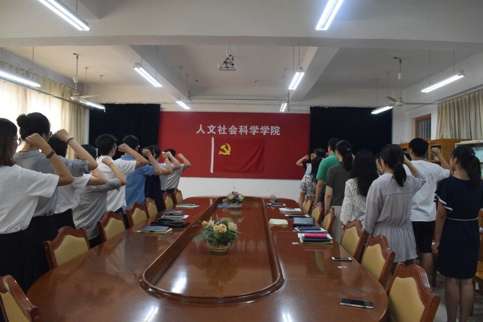 6月29日,在中国共产党成立 97 周年前夕,人文社会科学学院组织新老党员开展入党宣誓和重温入党誓词活动,激励党员师生立足本职岗位创先争优,以良好的工作业绩和学习成绩向党的生日献礼。学院党总支书记祝茂凯,院长王效仿及全体班子成员、学院各党支部书记、全体毕业生党员和新党员参加了宣誓。
