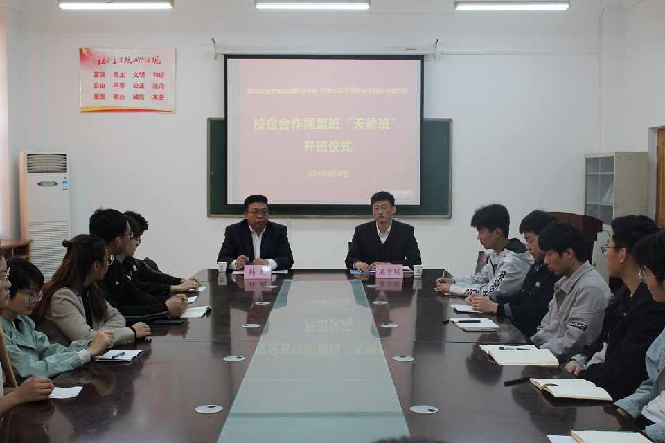 4月20日,动物科技学院校企合作同盟班“天骄班”开班仪式在学院会议室举行。天津市现代天骄农业科技有限公司董事长孙超,学院党总支副书记、副院长展学斌出席会议,学院天骄班学员参加会议。开班仪式上,孙超对学院所给予的支持表示感谢,阐述了校企合作举办同盟班的重要意义,希望同学们通过参加天骄班培训,明确未来的发展方向,成长为未来职场的精英人才。展学斌感谢企业对学院人才培养工作的支持,希望同学们珍惜机会,虚心学习求教,积极参加培训,遵守课堂纪律,在学习过程中要勤于思考,撰写学习体会,在实践中不断提高自身综合素质,为将来的发展奠定良好基础。