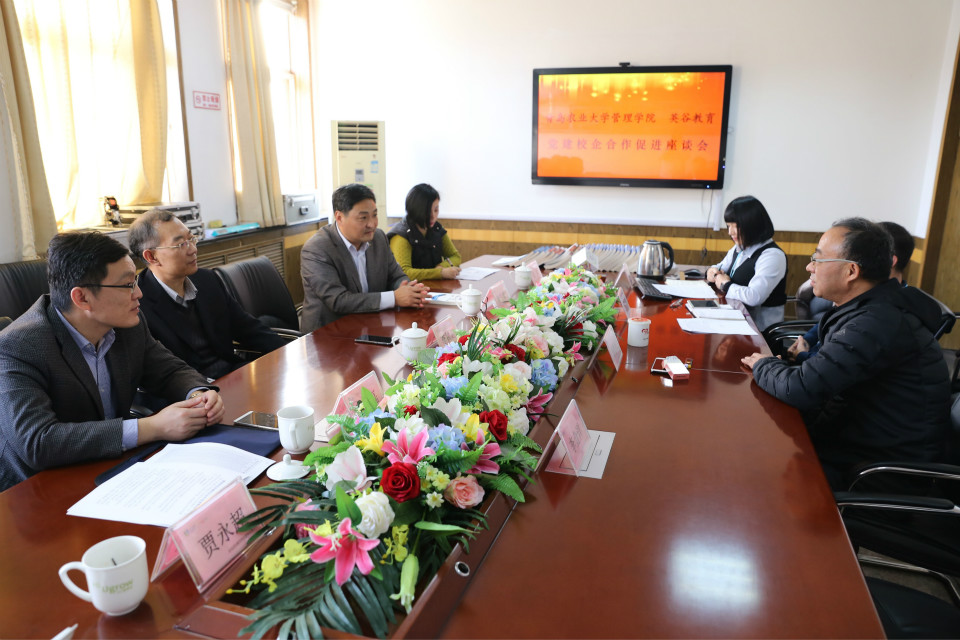 2017年11月8日,青岛农业大学管理学院院长李树超,党委书记唐传成,党委副书记、学工办主任焦磊专程赴青岛英谷教育科技股份有限公司,与英谷教育战略发展规划委员会主席韩敬海、教育运营服务中心总经理白鸿涛、党支部书记王晓娜及相关学生工作管理人员展开座谈,管理学院会计外包专业辅导员、院团委书记贾永超,物流外包专业辅导员张洁陪同前往。