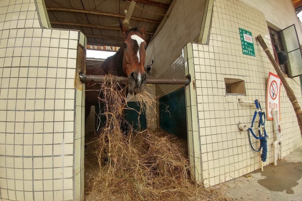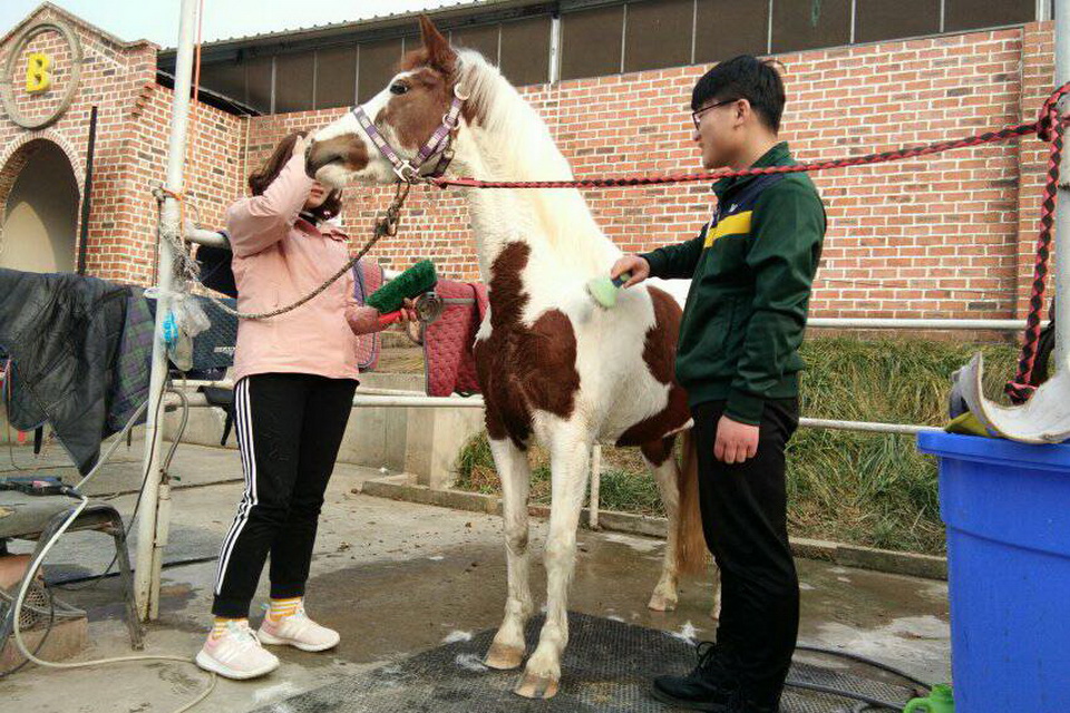马房的清洁工作完成之后,另一件密切关系马匹健康的工作是遛马和刷马。在成都天骁马术俱乐部,同学们在与老师们交流的过程中了解到每天定量的运动对马匹的健康十分重要,促进马匹的新陈代谢,锻炼马匹的肌肉力量,让马匹心情放松,更加驯服。同学们可以通过骑乘、打圈或遛马达到每日的运动量。在成都天骁的同学们在教练的指导下为马匹打圈,有些伤病马不适合打圈和骑乘,同学们就牵着它们遛马。海子在诗中说“从明天起,遛马,劈柴,周游世界。”这样的生活诗意而安宁。