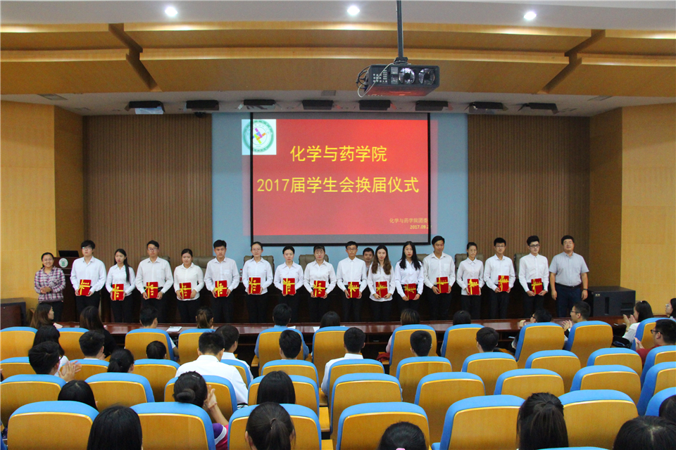 嘹亮的国歌奏响,全体人员起立,换届大会正式开始。会上,学院团委书记王海霞宣读了《化学与药学院2017届学生会主要干部名单》。党委副书记史雪辉为新当选的学生会骨干颁发聘书。随后2016届学生会主席王飞对过去一年的工作进行总结报告,分享经验心得,并为新一届学生会骨干送上的鼓励和祝福。新任2017届学生会主席杨景一做出了本届学生会的工作展望。