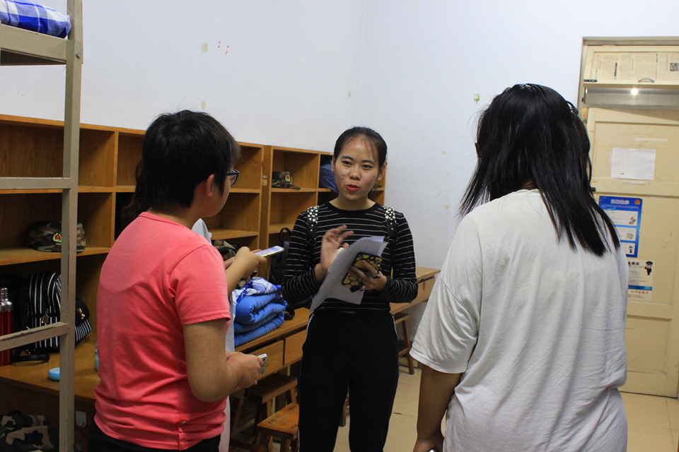 进入宿舍后,学生干部以聊天谈心的方式拉进与新生之间的距离,向新生询问入学后难以解决的困难和目前心理状况,包括步入大学遇到的困惑、军训情况、人际交往情况、新环境的适应情况等。在良好的气氛下同学们畅所欲言,部门成员对相关问题进行一一解答,并及时对情绪低落的同学进行心理疏导。
