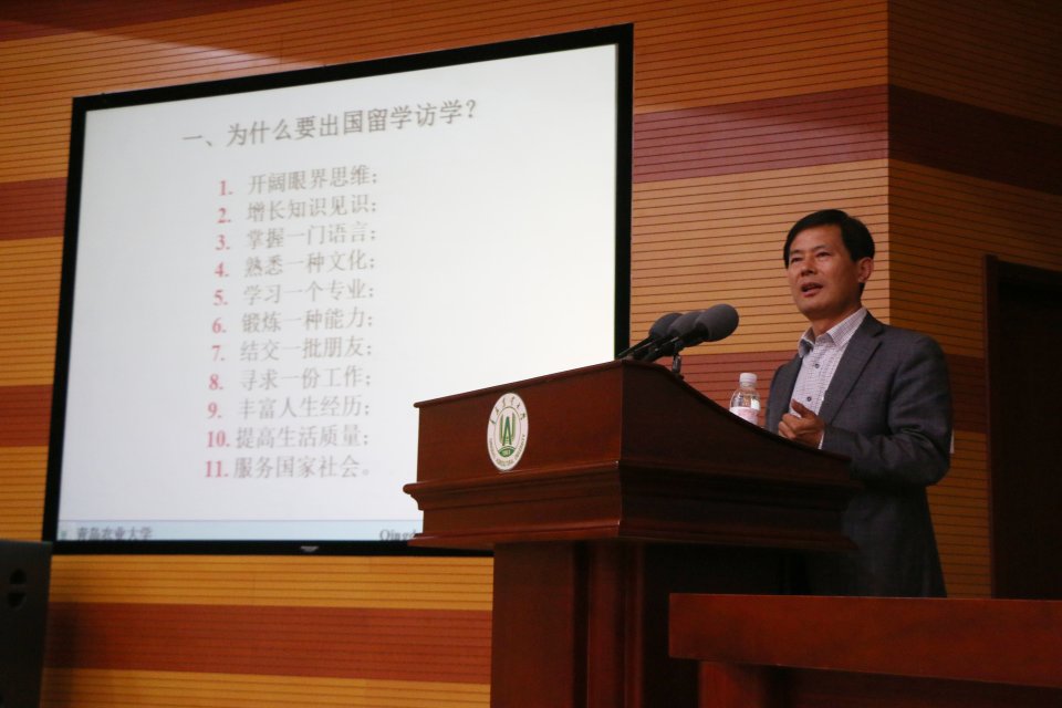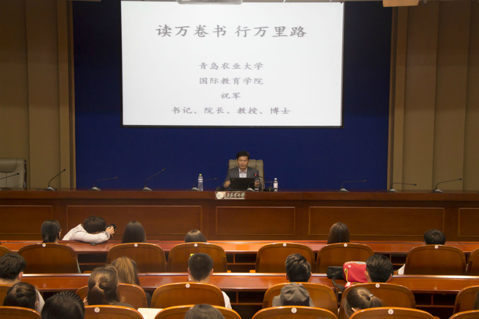 5月18日下午,青岛农业大学国际教育学院于学术会馆第一报告厅举办“读万卷书 ,行万里路——国外访学那些事儿”讲座。讲座由国际教育学院党总支书记、院长祝军主讲,大一、大二学生参加。