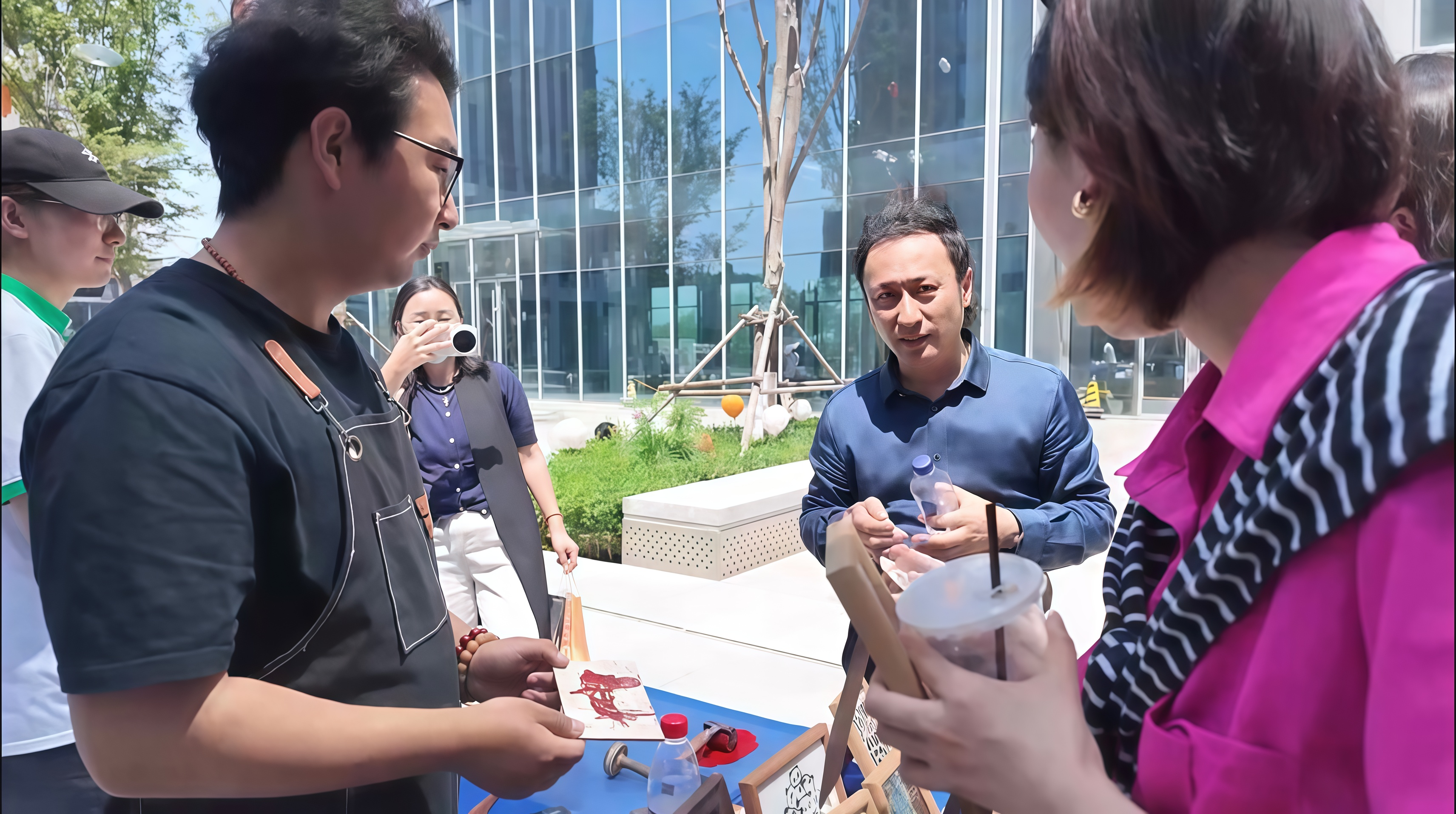 (院长李慧斌与学生“摊主”交流作品制作)