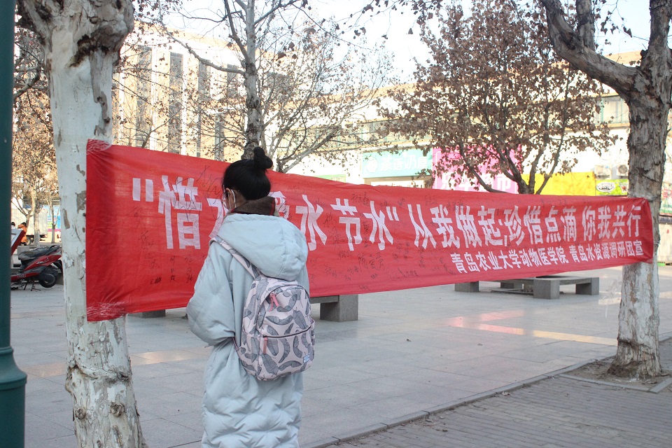 为了解当代大学生的节水意识和生活用水情况,动物医学院学生会制作并向500余名在校学生发放了关于生活中用水情况的调查问卷,共收回有效问卷420余份。根据数据整理,大部分大学生具备较高的节水意识,但仍有部分大学生在生活用水方面铺张浪费,缺乏随手关水龙头、循环生活用水等好习惯。针对调查结果,动物医学院水资源调查团的志愿者们开展了节水知识宣讲活动,动员广大学生共同关注水资源紧缺的现状和存在问题,树立绿色文明意识、生态环境意识和可持续发展意识,从自身做起,节约每一滴水,在日常生活中养成良好的用水习惯,同时分享了一些“一水两用”等节水常识和节水小窍门。志愿者们还制作了“节水、爱水、惜水,从我做起;珍惜点滴,你我共行”宣传条幅,组织在校学生在条幅上签名并承诺节约用水,保护水资源。