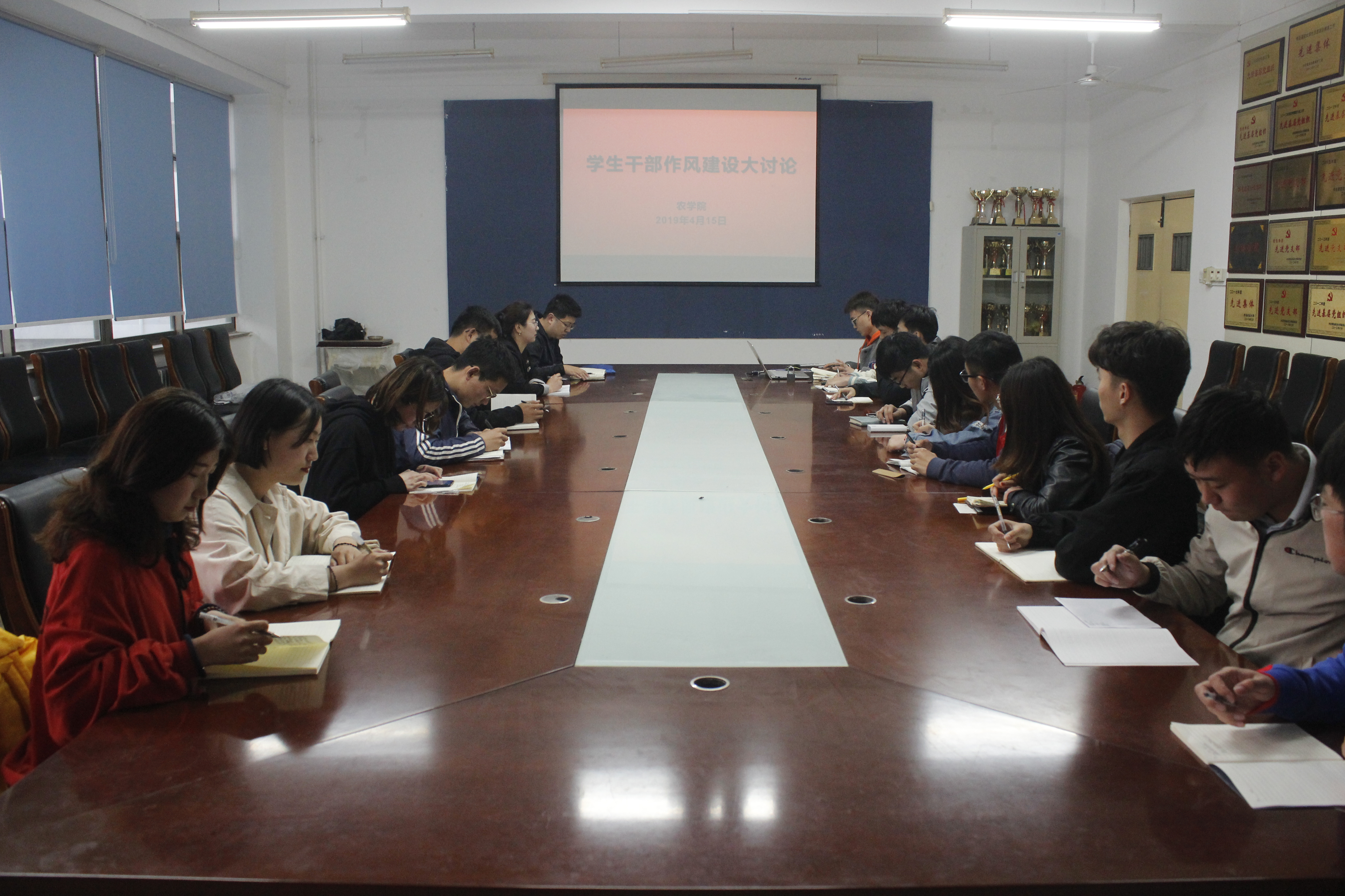4月15日,青岛农业大学农学院于生物楼N区组织开展学生干部优良作风建设大讨论,农学院团委书记姜涛、辅导员谷元兴、刘宁和2018届学生会成员参会。