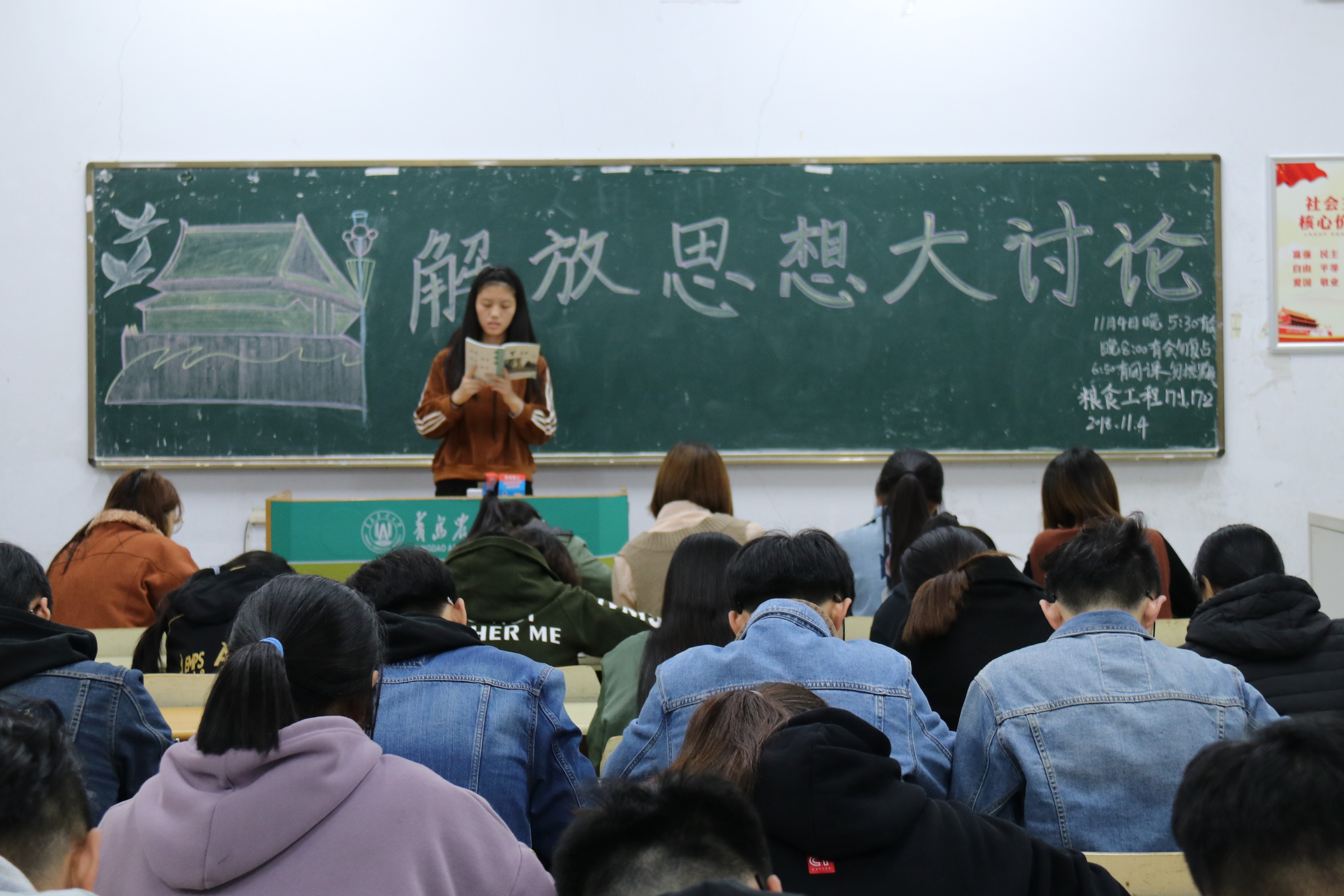 11月4日,青岛农业大学食品科学与工程学院在教学区开展“解放思想大讨论”主题团课。学院2017、2018级全体学生参与了此次学习。