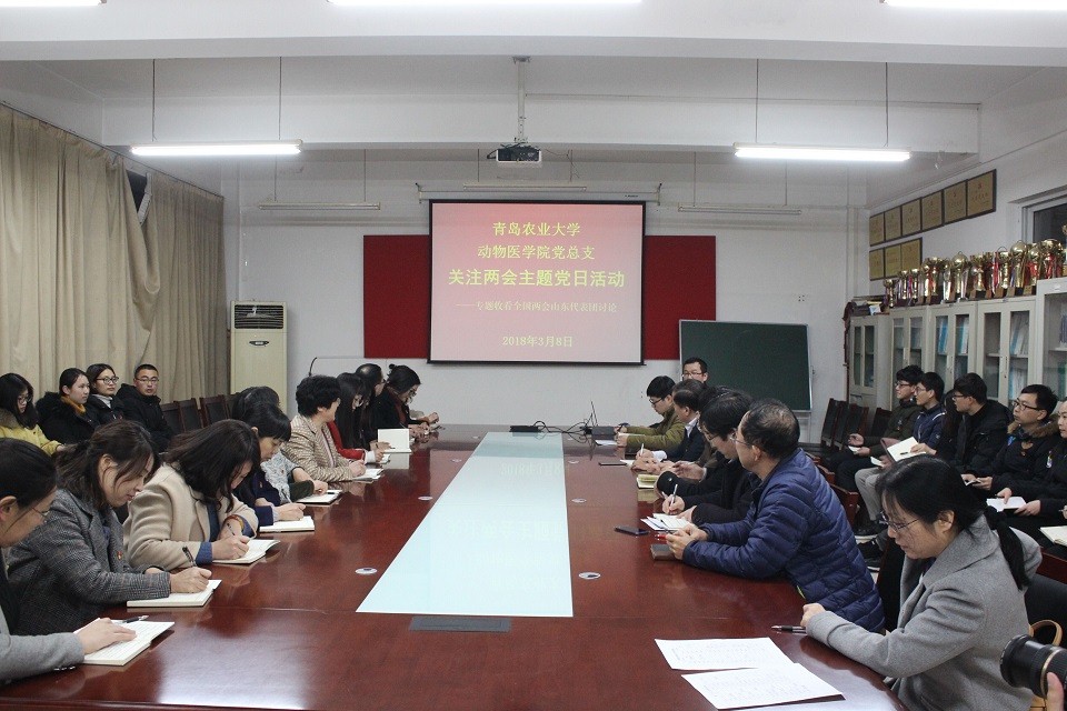 3月8日,青岛农业大学动物医学院党总支于学院会议室举办了关注两会主题党日活动。此次活动由党总支书记孙运彩主持,全体党员参加了活动。山东省电视台农科频道的记者对此次党日活动进行了全程录制。