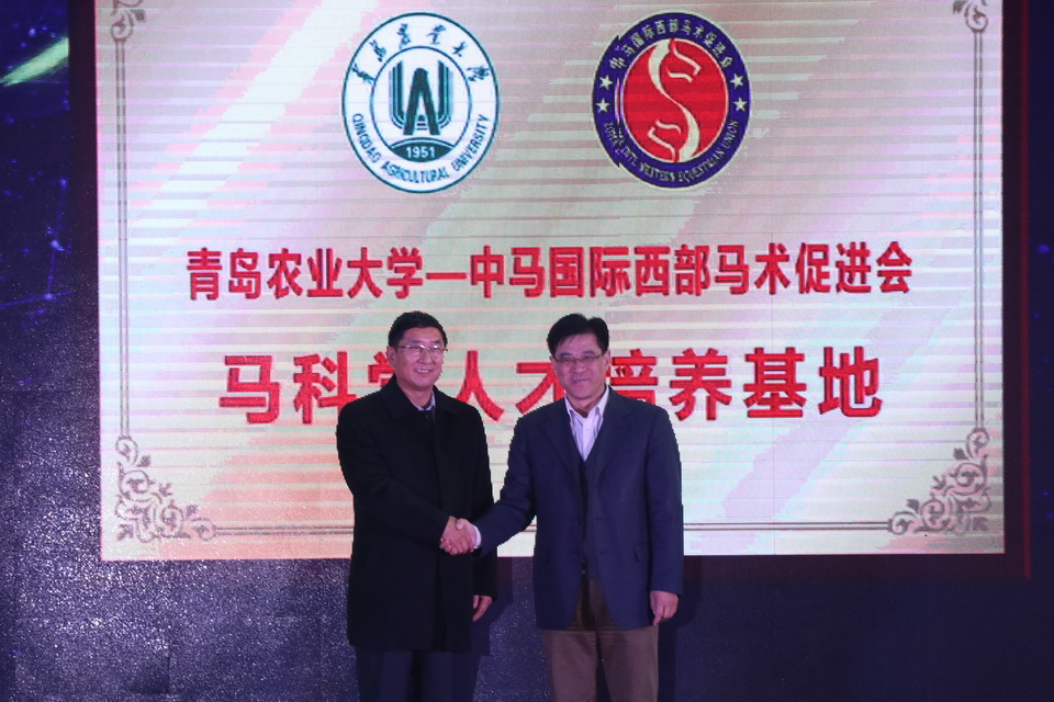 杨同毅和中马国际西部马术促进会监事会副主席、副会长,青岛登程马术运动俱乐部曾兆文董事长共同为青岛农业大学——中马国际西部马术促进会马科学人才培养基地揭牌。