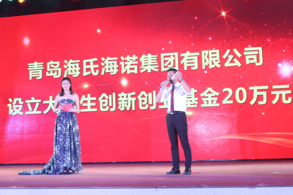 青岛海氏海诺集团创始人、董事长麻兆晖先生设立20万元大学生创新创业基金,杨同毅向麻兆晖先生颁发捐资助教贡献奖奖杯。