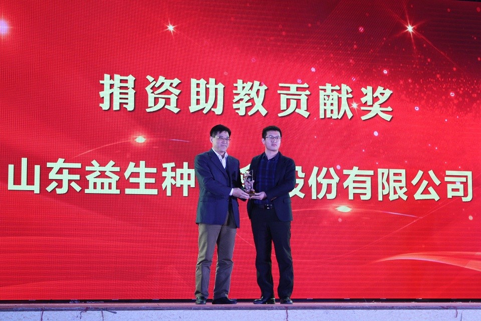 杨同毅还向益生股份等其他11家设立奖助学金的合作企业颁发了捐资助教贡献奖奖杯。