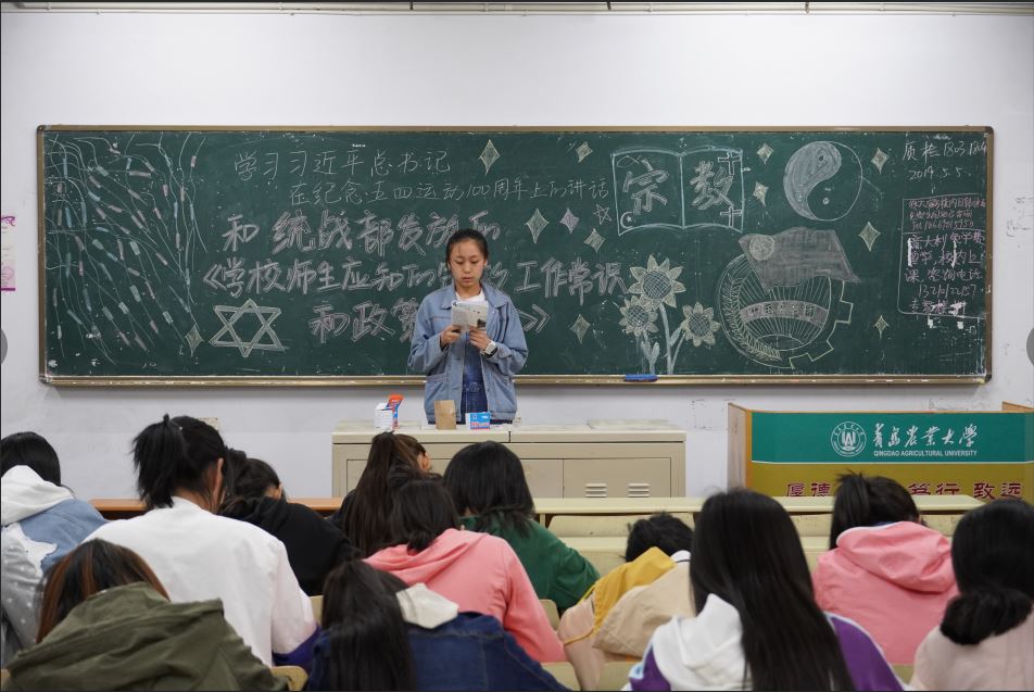 5月5日,青岛农业大学食品科学与工程学院在教学区开展“纪念五四运动一百周年”和“宗教政策法规教育”政治学习。学院2017、2018级全体学生参与了此次学习。
