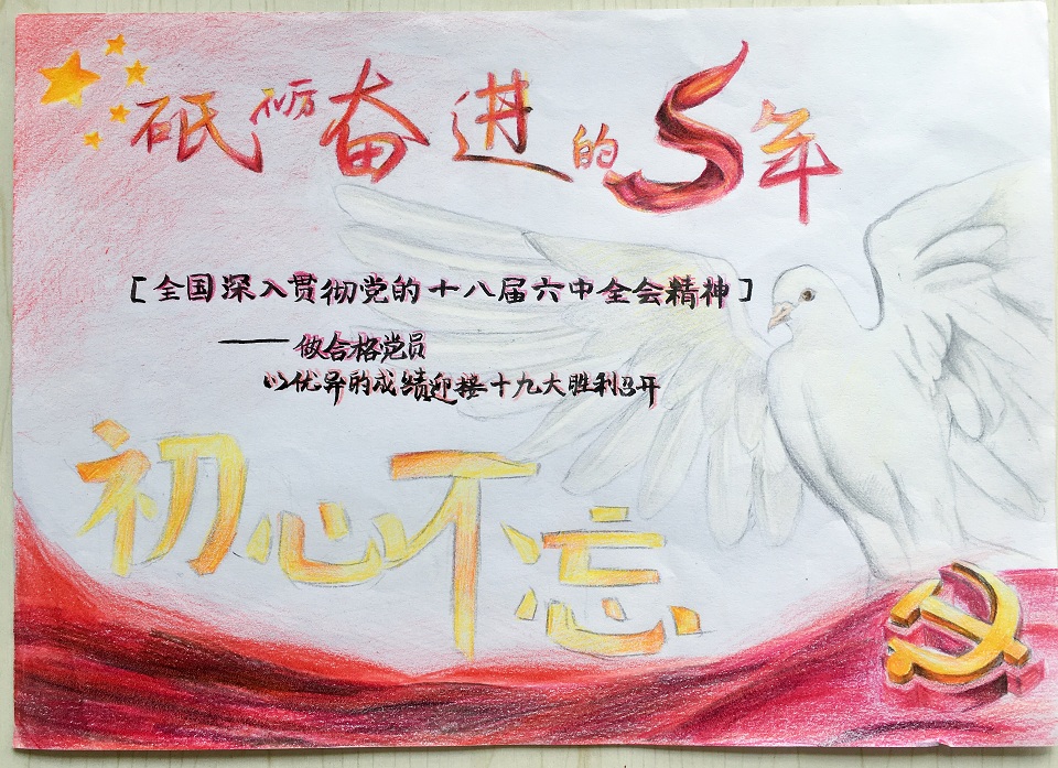 本次作品征集包括书法和绘画两类,要求参赛者围绕“砥砺奋进的五年”这一主题创作书法或绘画作品,内容需积极向上,能体现社会主义核心价值观,反映时代风貌,展现当代中国、校园、大学生新形象。活动得到了同学们的热烈响应,共收到50余份优秀作品。经评议小组评选,动医1704班侯丹阳、动医1705班孙瑞同学分别获书法组、绘画组一等奖。
