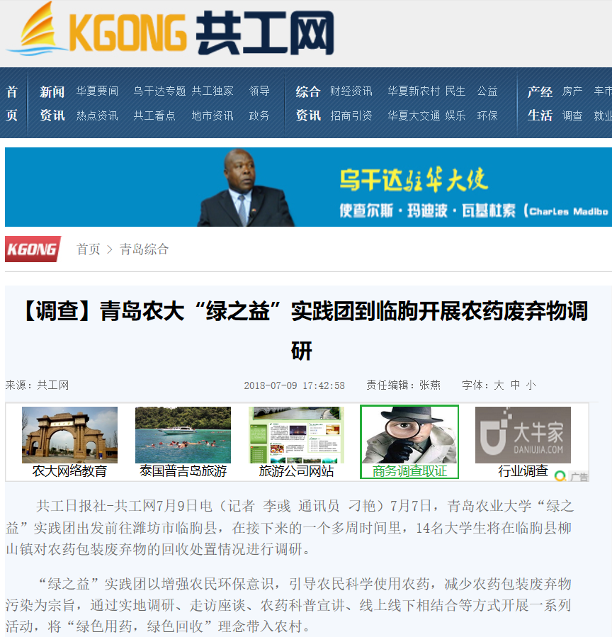 共工日报社-共工网7月9日电(记者 李彧 通讯员 刁艳)7月7日,青岛农业大学“绿之益”实践团出发前往潍坊市临朐县,在接下来的一个多周时间里,14名大学生将在临朐县柳山镇对农药包装废弃物的回收处置情况进行调研。