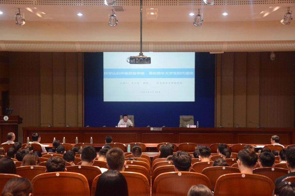 牟少岩从历史角度,首先以大豆的产量和需求为引子,将中国与美国进行对比,阐述事实。随后用生动的实例详细讲述了此次中美贸易争端的起源和过程,并从中美贸易争端基本情况、中美贸易争端背景、中美贸易争端本质、中美贸易争端对我国的影响以及作为新时代青年应当如何认识贸易战并进一步认识作为新时代大学生应如何负担起使命这五个方面进行阐述。他表示,中美贸易争端有历史渊源和现实情况,同学们要学会从历史的维度、专业的角度辩证地分析这场贸易争端,从中发现和领悟到中国坚持改革开放、产业转化、经济振兴的政治优势和制度优势,增强理论自信、制度自信、道路自信、文化自信。