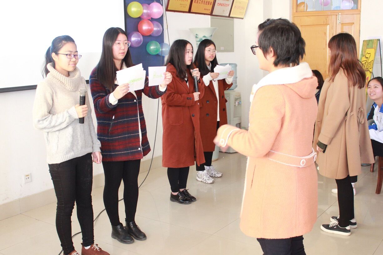 丢掉淑女的形象,一个个搞怪的动作展现在大家眼前,让选手们“望而生畏”的“外文单词你比我猜”环节到了。表演者充分发挥其想象力,手势动作、英文解释齐上阵,每个词语表演有声有色;猜词者绞尽脑汁,大胆揣测表演者的意思,默契的配合获得了阵阵掌声。