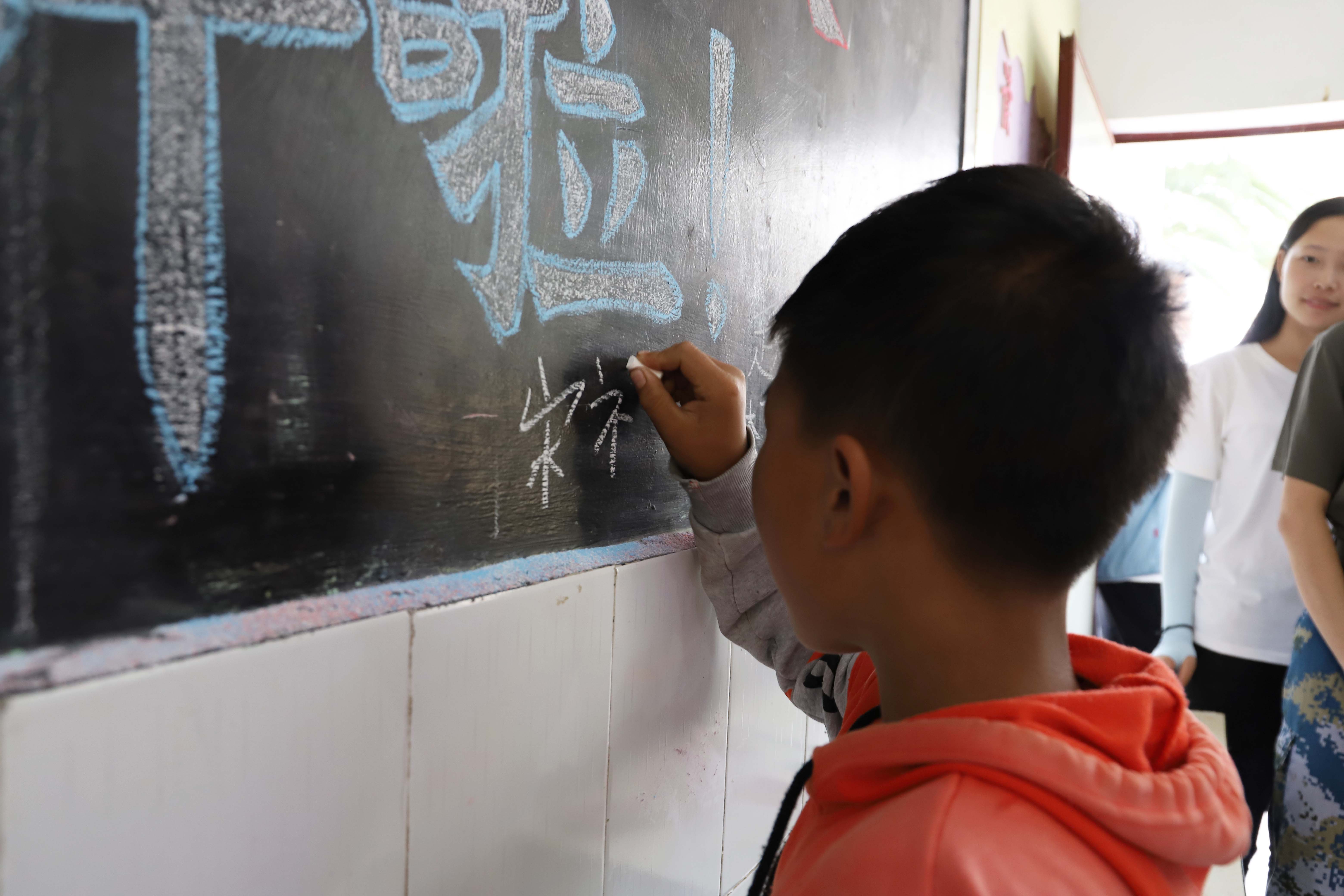 “从前有一棵李子书,被蚊子咬了一口,就结出了果实,所以我叫李文杰……”调研实践团队长李文杰以及队员们用风趣幽默的方式向小朋友们做着自我介绍,希望以此来快速拉近与同学之间的距离。在那一双双注视的眼睛中,充满着好奇和喜悦,黝黑的脸上泛出纯真的笑容。播放的有关爱国的视频,也让孩子们肃然起敬,心生敬意。