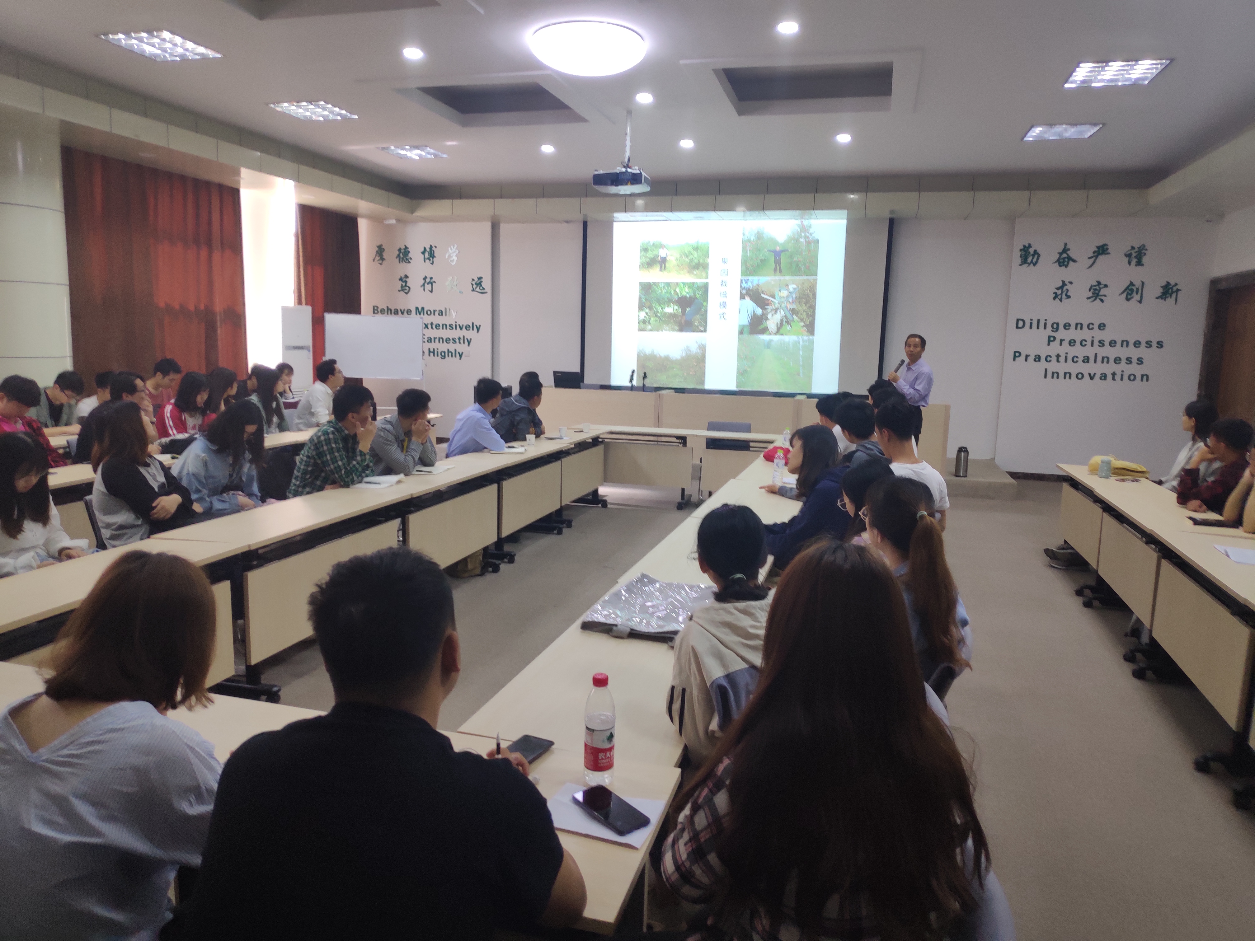 会议伊始,原永兵以“转变观念,学好本领,勇于实践,为新时代水果产业现代化作出贡献”为题,向全体与会学生介绍了现代苹果出产关键技术的发展历史,讲述了“优质高效生产、健康普惠消费、环境友好优美、新时代水果产业现代化任务”等园艺产业最新的发展理念与学科动态。随后,孙君同先生结合自身经历,阐述了现今越来越多资源正流向农村的趋势,乡村振兴为同学们的就业、创业提供了广阔的舞台,并号召同学们回到农村,为农业发展作出贡献。接着,李元先生通过现代农村人才流动问题,以“创业就业一体化,我们与行业共成长”为题,介绍了农业产业发展的现状,农业产业现代化、机械化、智能化发展趋势,以及现代农业产业与国际分工前景,鼓励引导学生学好专业知识,练就扎实本领,坚持理论联系实际,结合社会和时代发展树立自己的就业目标。