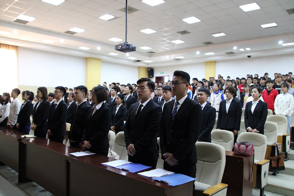 2018届学生会主席郭贽豪代表新一届学生会全体成员向关心和支持学生会工作的领导、老师表示感谢。他表示将带领新一届学生会成员从学习为先,建动科学生会新风貌;工作进取,创动科学生会新品牌;加强管理,严格遵守《学生会、研究生会干部自律公约》三个方面做好学生会工作,努力将新一届学生会建设成为一支“有能力、肯奉献、能自律”的学生队伍。