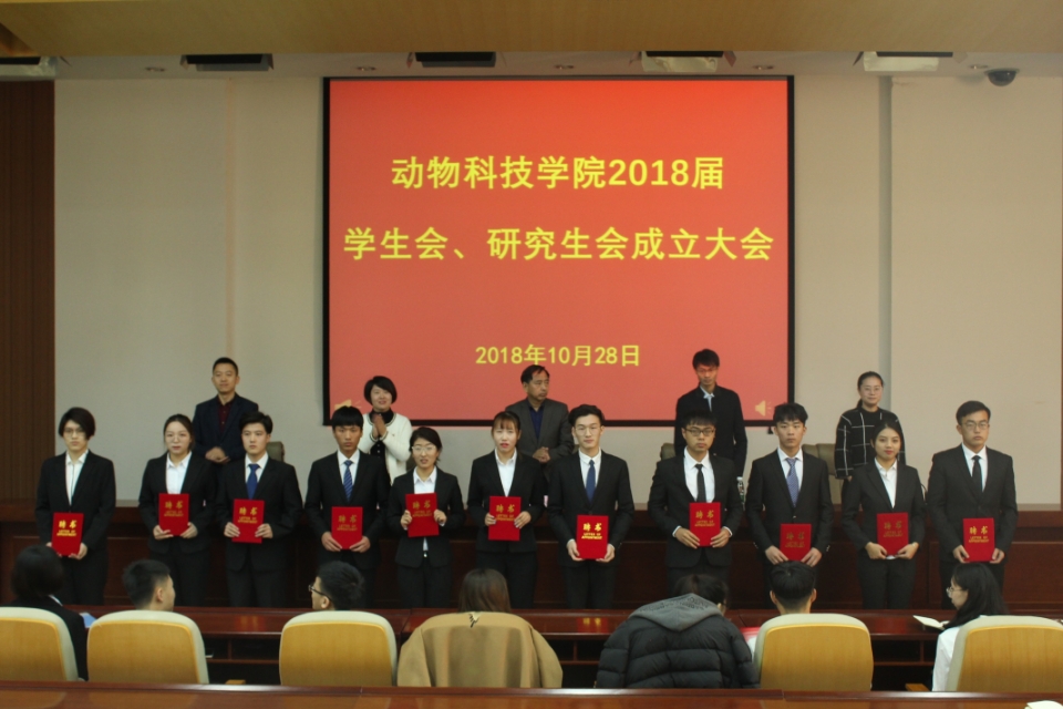 范楚琦宣读《动物科技学院2018届研究生会、学生会成员名单》,并宣布学院2018届学生会、研究生会正式成立。