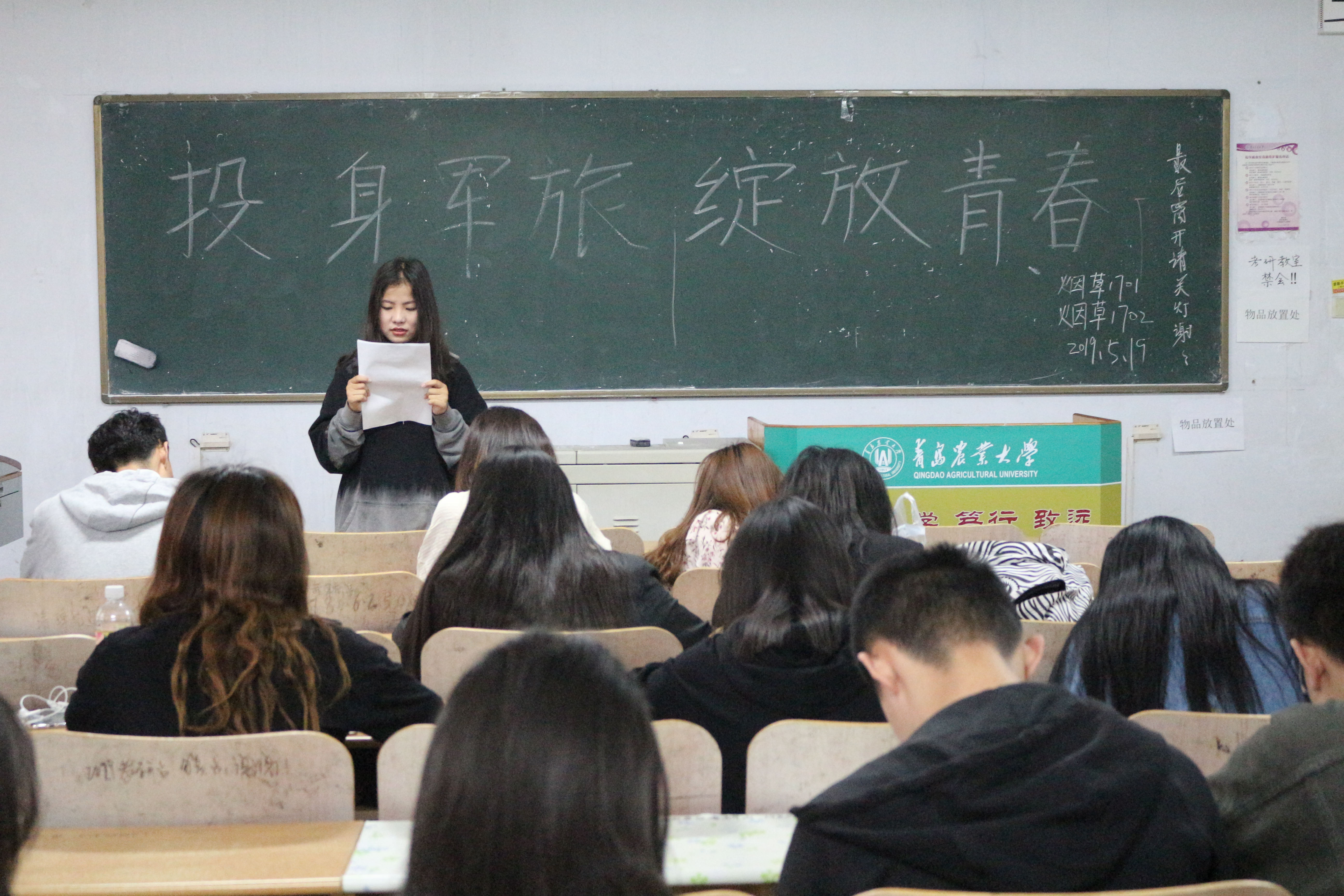 为响应习近平总书记提出的强军兴军伟大号召,鼓励当代大学生在军营中磨炼自我,5月19日,青岛农业大学农学院于教学区开展“投身军旅,绽放青春”主题团课,学院2017、2018级全体同学积极参加。